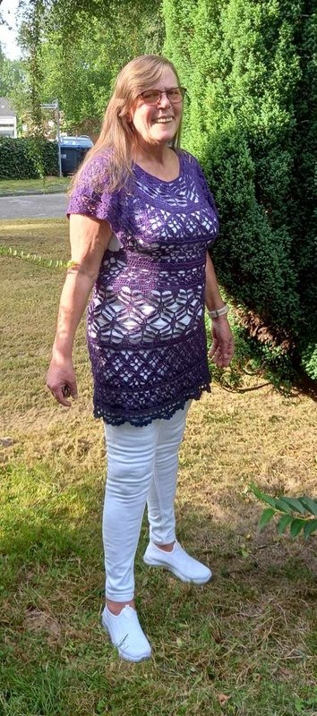 für die violette Tunika in Größe M Bobbel 3fädig, 1050 m, Häkelnadel Nr. 3