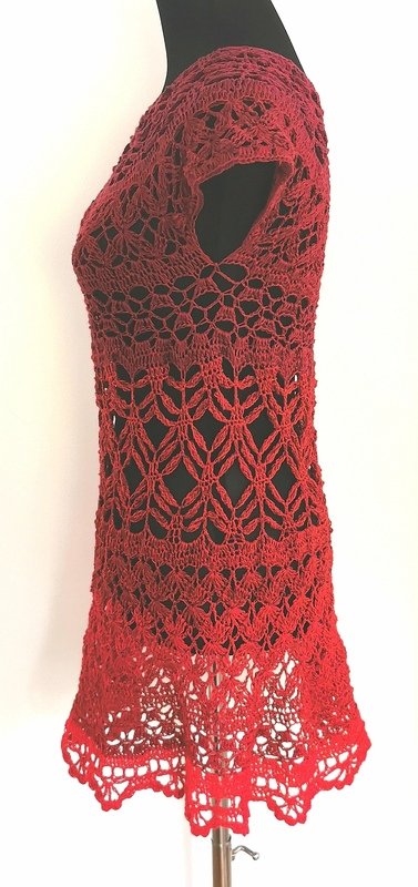 für die rote Tunika in Größe M, die bei einer Körpergröße von 168 cm bis über das erste Drittel des Oberschenkels reicht, ca. 950 m Bobbel 3fädig