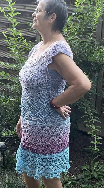 für das türkis-lila Kleid in Größe L 788 m Twister und 244 m Twister Solid, Häkelnadeln Nr. 3,75 und 4