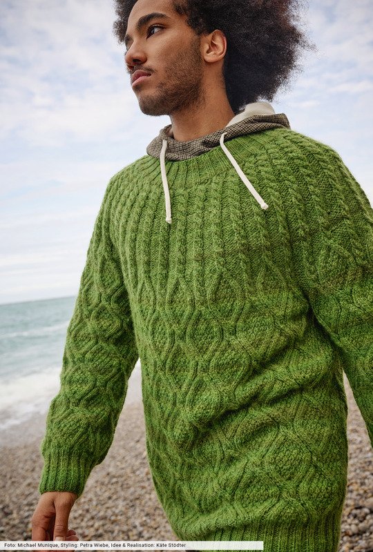 Ein weiches Schurwoll-Alpakagarn bildet die Basis für den moosgrünen Pulli, der besonders durch die plastischen Rautenstrukturen im unteren Teil Aufmerksamkeit erregt. Für die Rundpasse werden dann alle Maschen auf eine Rundstrick-Nadel genommen und du setzt die Arbeit im Zopfmuster fort. Dafür haben wir eine Strickschrift angelegt, in der auch die Abnahmen zu finden sind. Zum Schluss nur noch die gerippte Halsblende stricken und die Kanten zusammenähen – fertig ist ein Stück fürs Leben!
