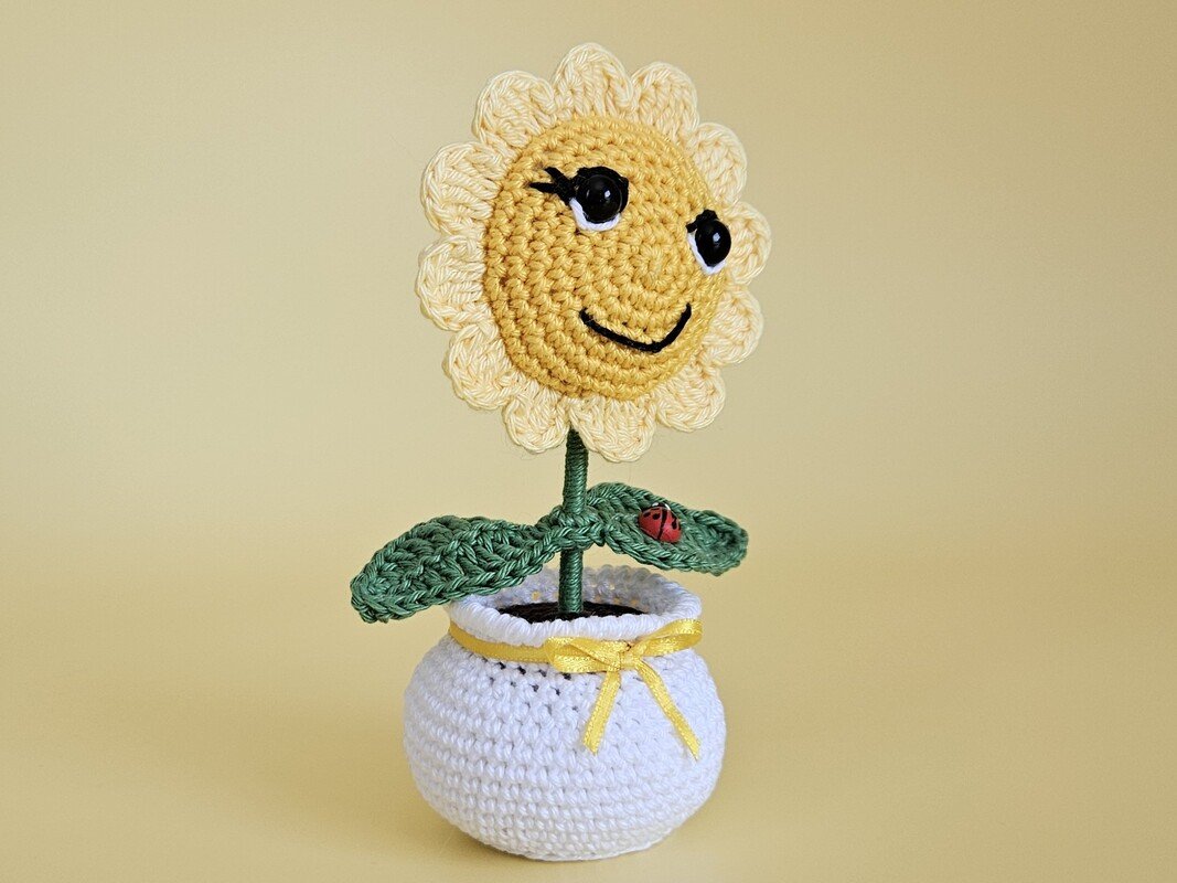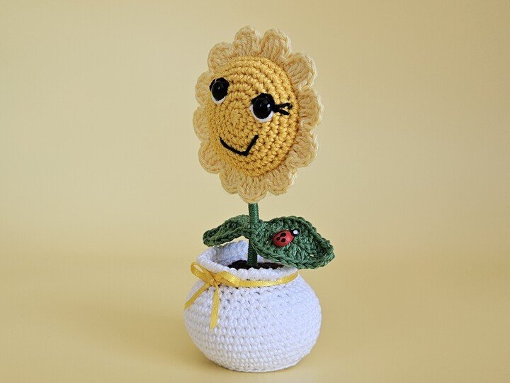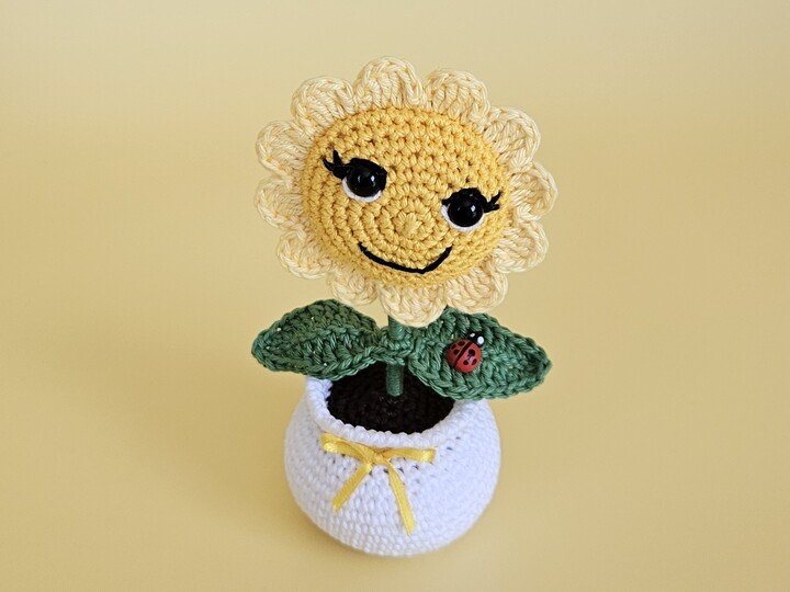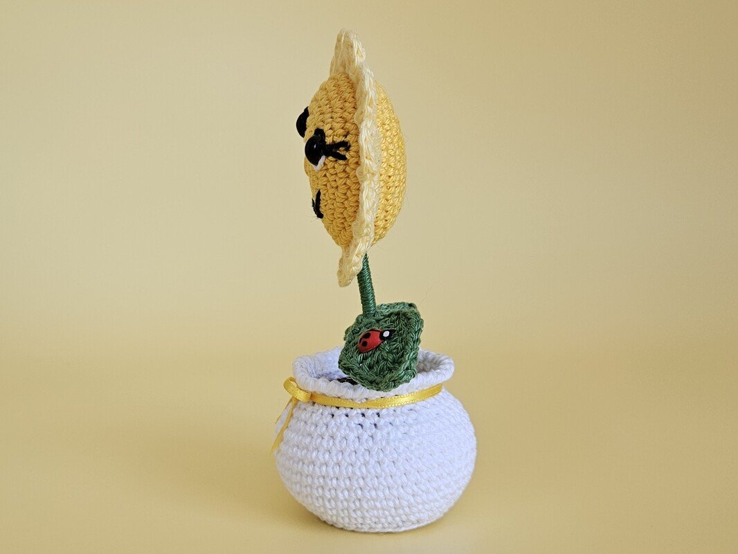 Sie steht in einem weißen Blumentopf, verziert mit einer gelben Schleife und ein kleiner Marienkäfer hat es sich auf einem Blatt gemütlich gemacht.