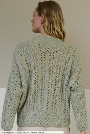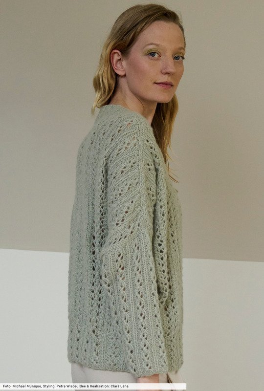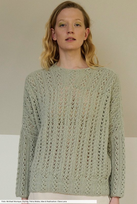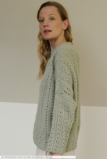 Ready to relax! Endlich mehr Zeit für Ruhe und Entspannung verspricht dieser lässige Mohairpulli, der durch seitliche Zunahmen und sichtbare Schulterschrägungen für einen coolen Stricklook sorgt und die Körperkonturen sanft umschmeichelt. Hinzu kommen hohe Bündchen, schmale Ärmel und ein Stehkragen – alles Details, die zweifelsohne zu der spannenden Schnittführung beitragen. Last but not least: Zwei verschiedene Ajourmuster machen ihn zum eleganten Hingucker in zartem Mintgrün.