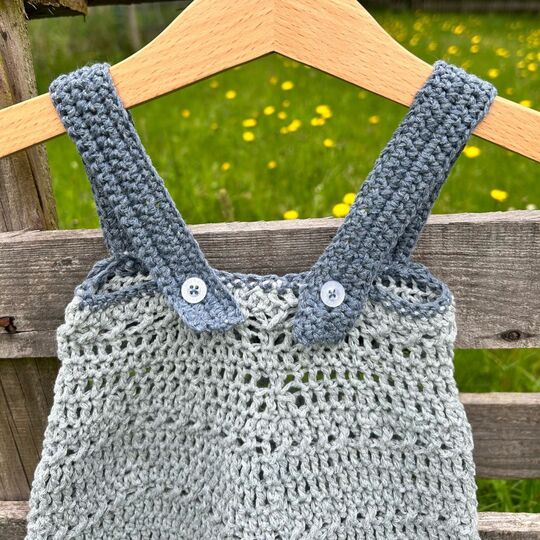 Das Kleid beginnt am Saum und wird mit halben Stäbchen , einfachen Stäbchen und Kreuzstäbchen gehäkelt. Die Träger bestehen aus festen Maschenreihen. Mit seinem Jeanslook, den Trägern mit coolen Applikationen und den zwei aufgesetzten Taschen wird das Kleid zu einem echten Highlight!