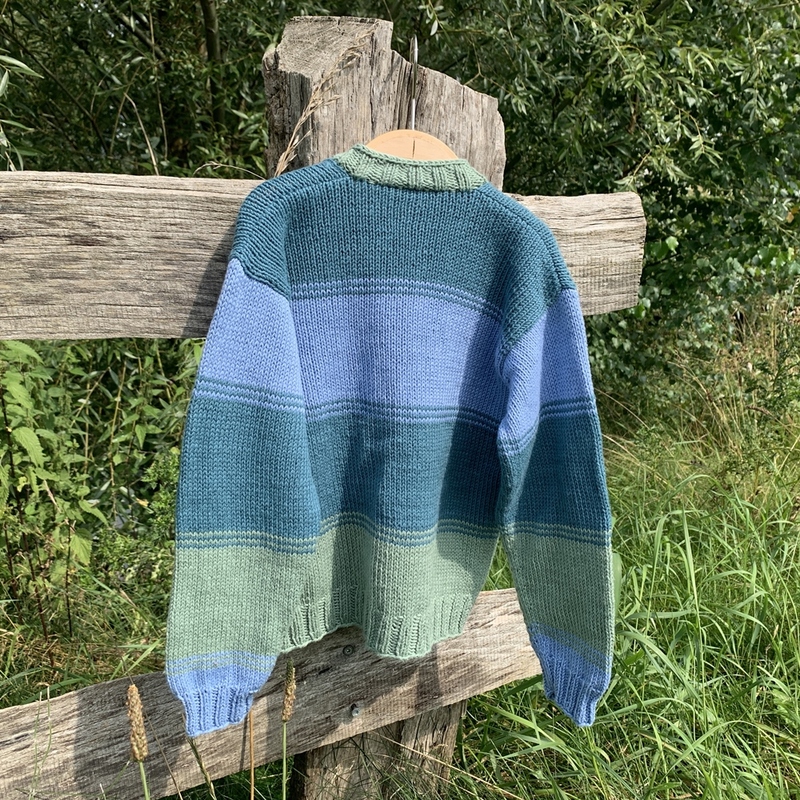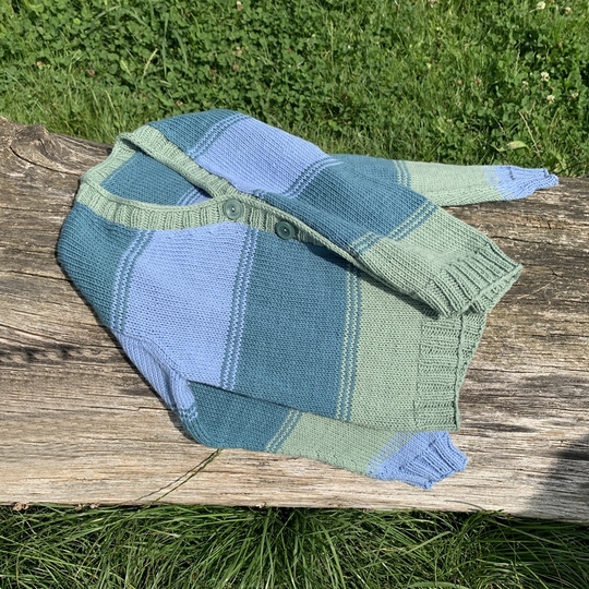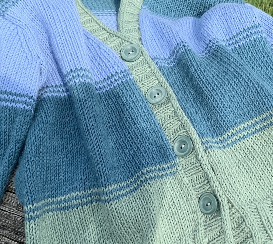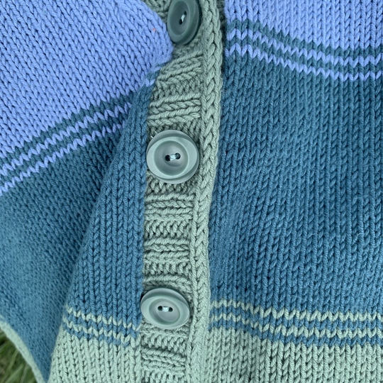 Die Jacke hat lange Ärmel, die ebenfalls separat gestrickt werden. Der V-Ausschnitt wird durch gezieltes Abnehmen von Maschen geformt. Die Knopfleiste wird angestrickt und mit einem I-Cord Rand beendet.