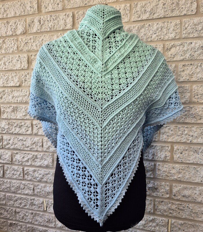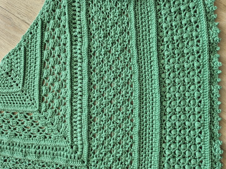 Mit einem 3-fädigen Bobbel wird das große Dreieckstuch ist ca. 140cm breit und 70cm tief, mit einem 4-fädigen Bobbel wird es ca. 170cm breit.