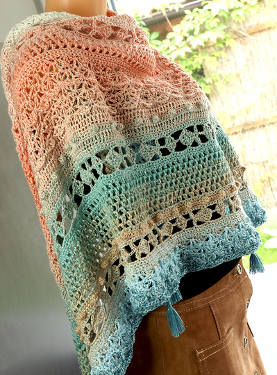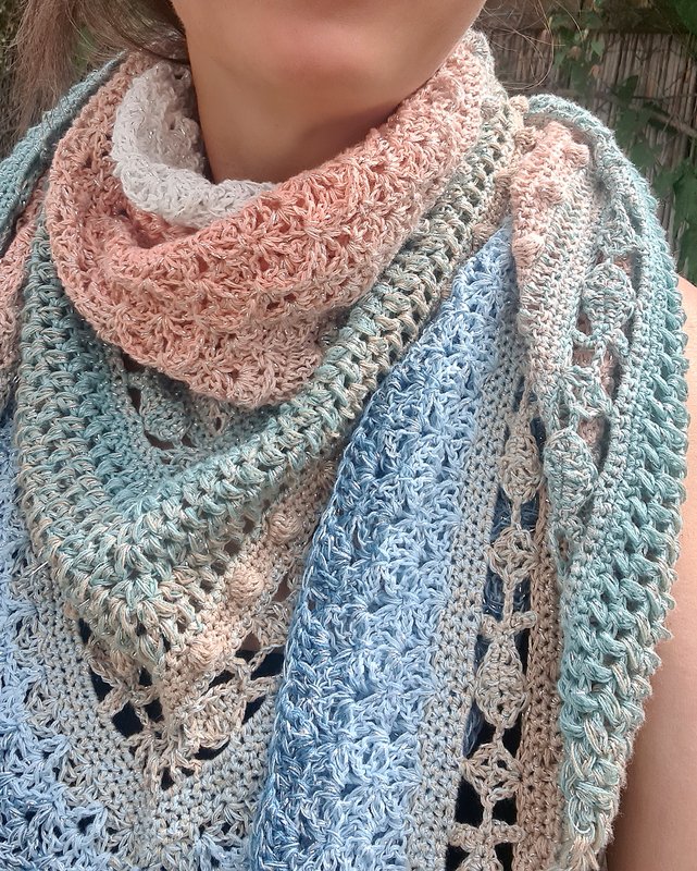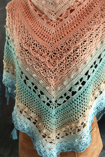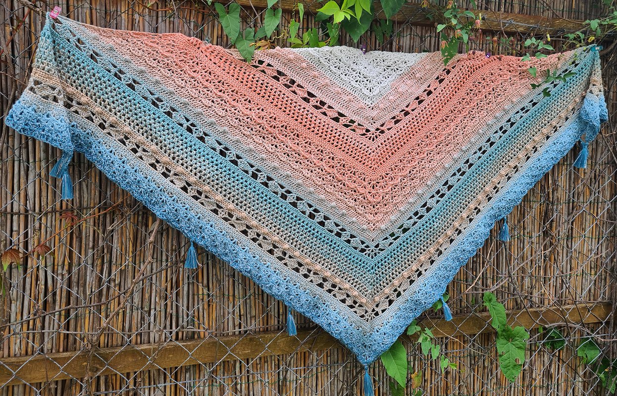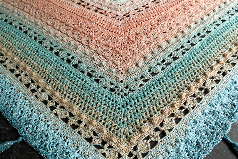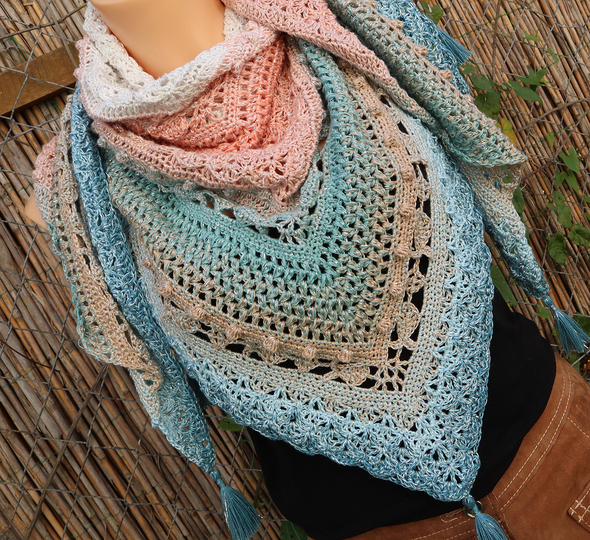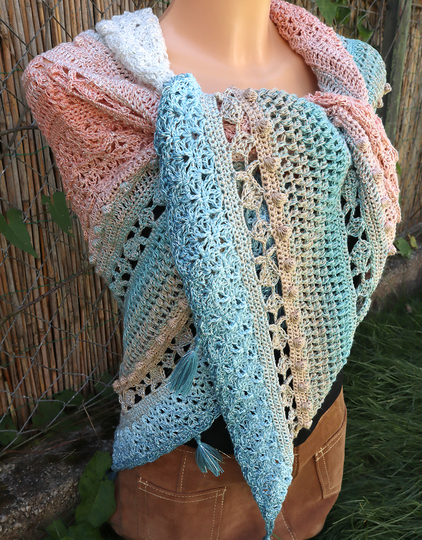 Hier tummeln sich Muscheln, Perlen und kleine Fische - vielfältige Häkelmuster die keine Langeweile aufkommen lassen und das Ergebnis ist ein absoluter Blickfang und Lieblingsstück