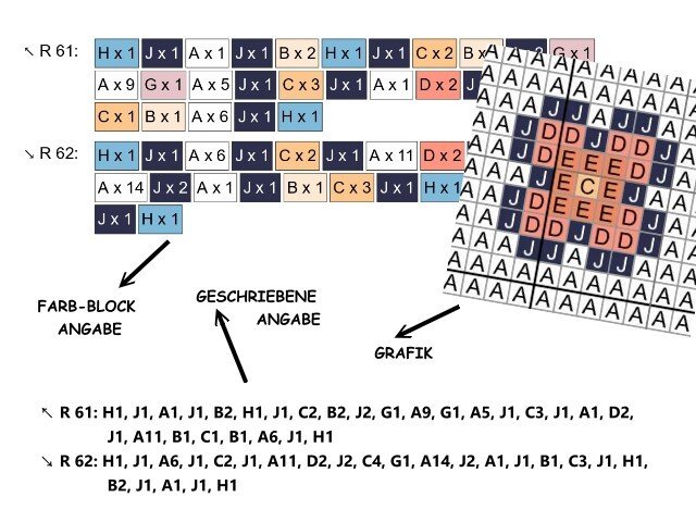 Weiters könnte es laut Grafik(en) in feste Maschen, halbe Stäbchen, Stäbchen, tunesisch häkeln, Bobble Stitch etc. gearbeitet werden.