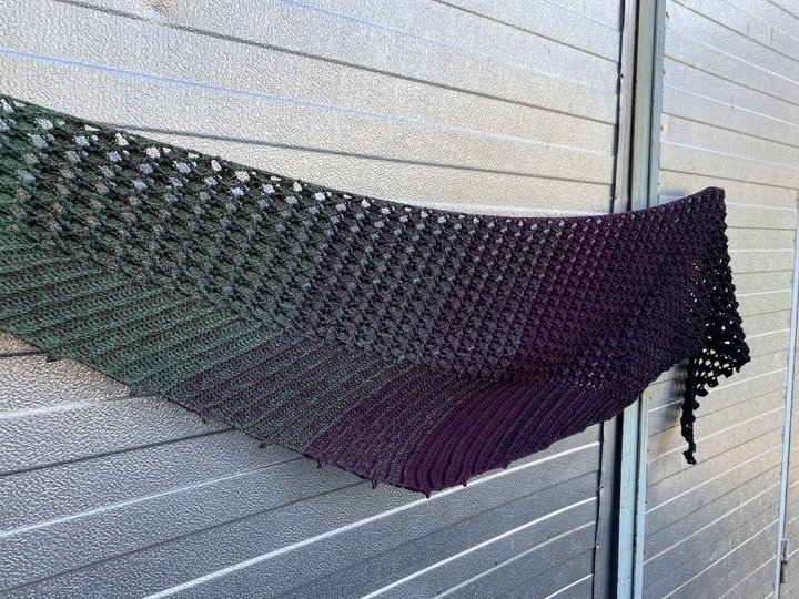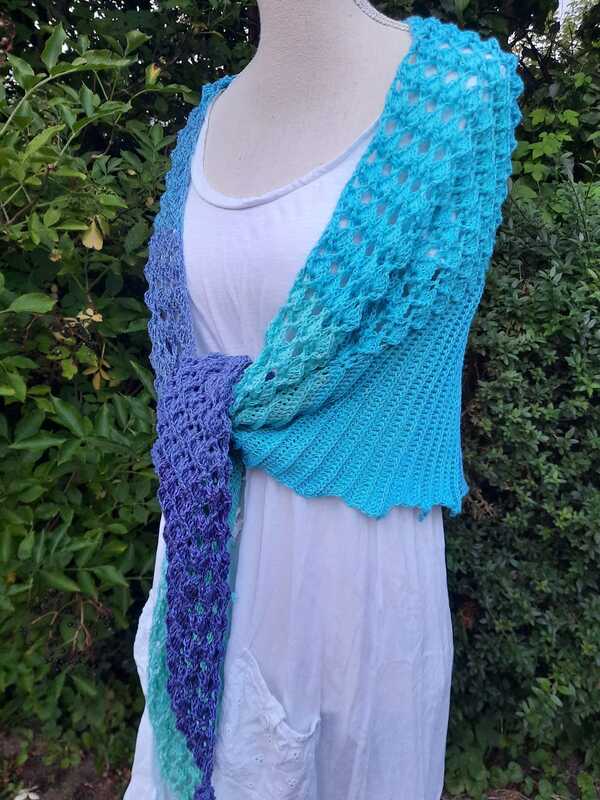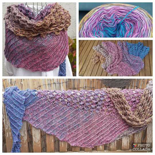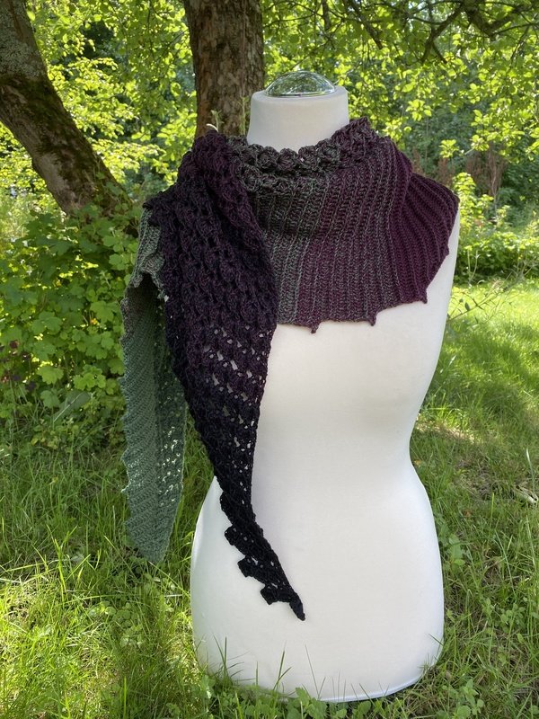 Lohemond ist ein Schal der am Anfang mit Zunahmen gearbeitet wird und am Ende werden wieder Maschen abgenommen. So hat dieser Schal zwei Spitzen und ist in der Mitte breiter. Das Muster ist schnell zu merken und es lässt sich super nebenbei häkeln. Durch die Form ist der Schal auch für Garn ab 800m geeignet.