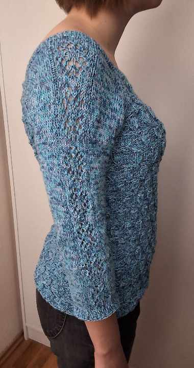 Das heisst, das Shirt / der Pulli / das Kleid wird in Runden von oben nach unten gestrickt und es entstehen keine Nähte vom lästigen Zusammen-Nähen. Außerdem kann durch diese Strickform sehr gut die individuelle Weite und Länge reguliert werden, auch die Arme können den individuellen Bedürfnissen angepasst werden, entweder als Kurzarm oder auch Langarm-Shirt.