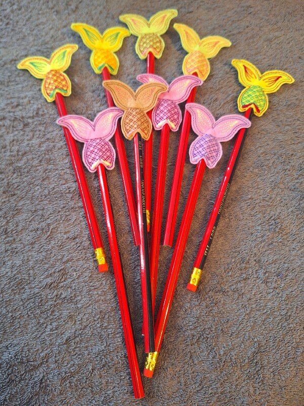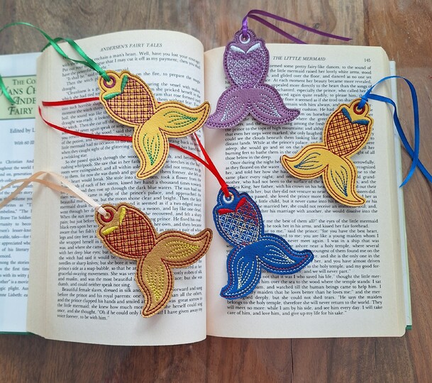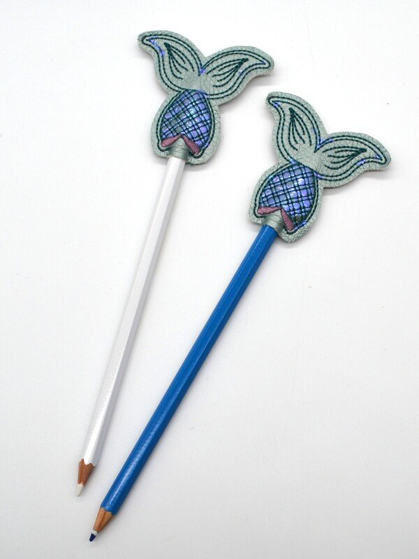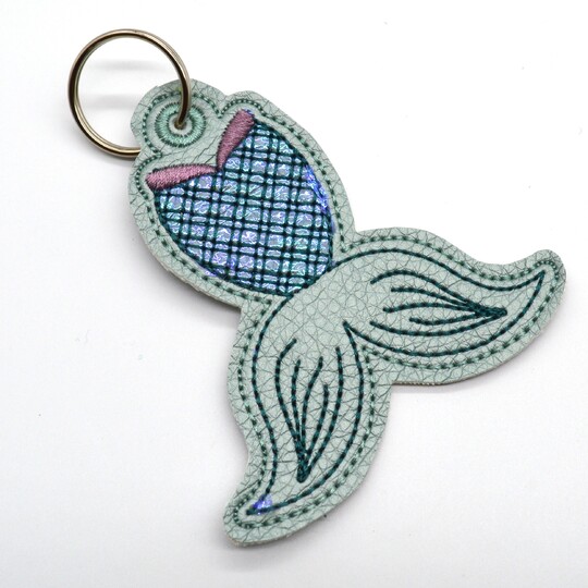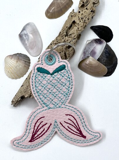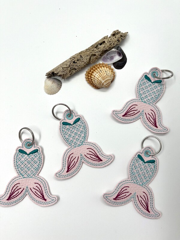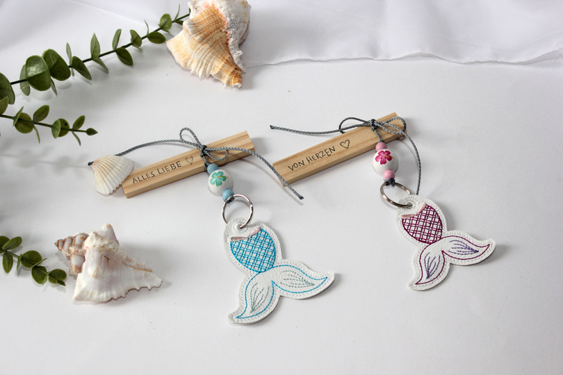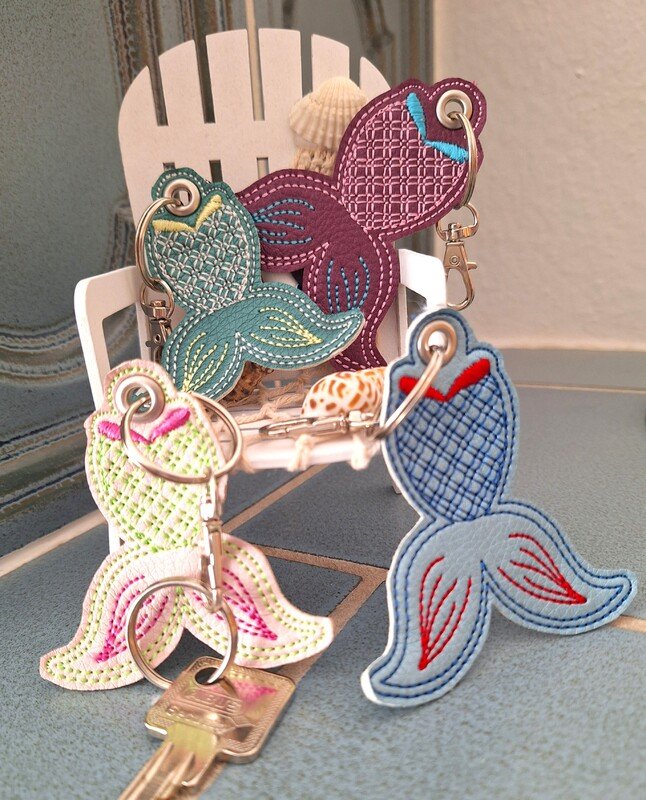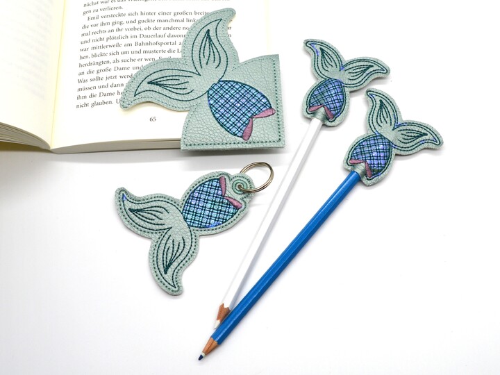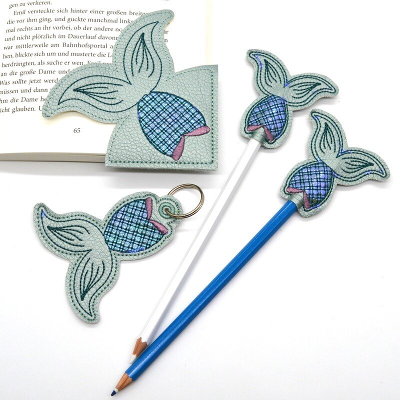 Stickdatei Meerjungfrauenflosse im SET mit Schlüsselanhänger, Buchecke und Stiftetopper.