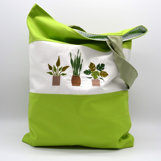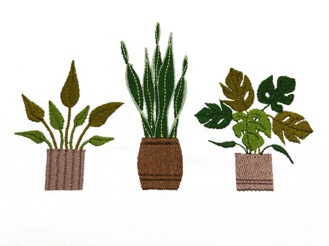 Dreierlei Grünpflanzen in ihrem Blumentopf: eine dekorative Stickdatei für wohnliche Dekorationen.