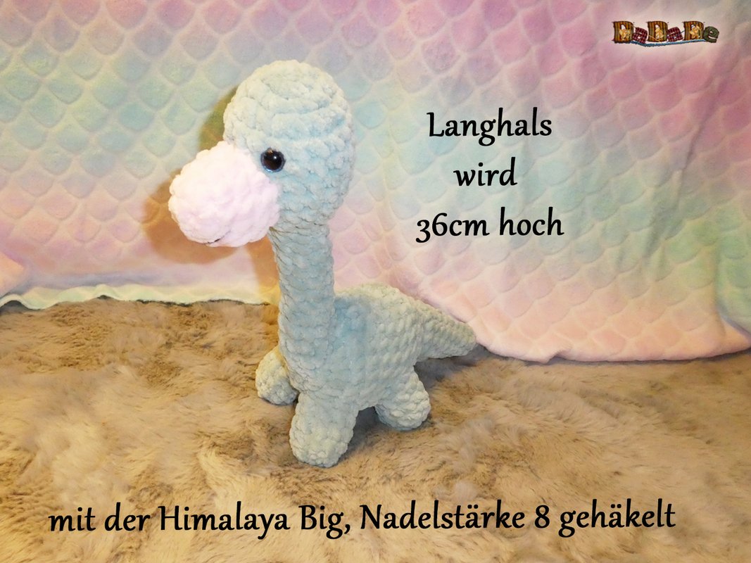 Mit Chenillewolle und der Nadelstärke 8 gehäkelt, wird der Dino ungefähr; 36cm