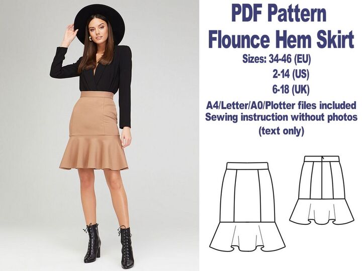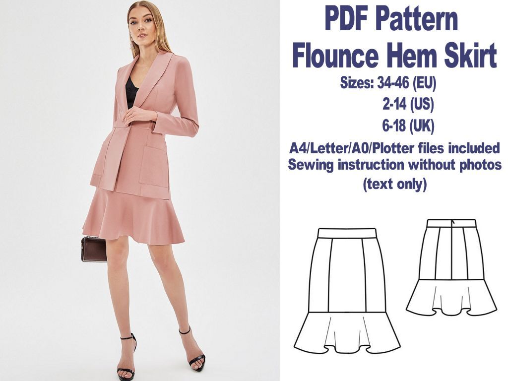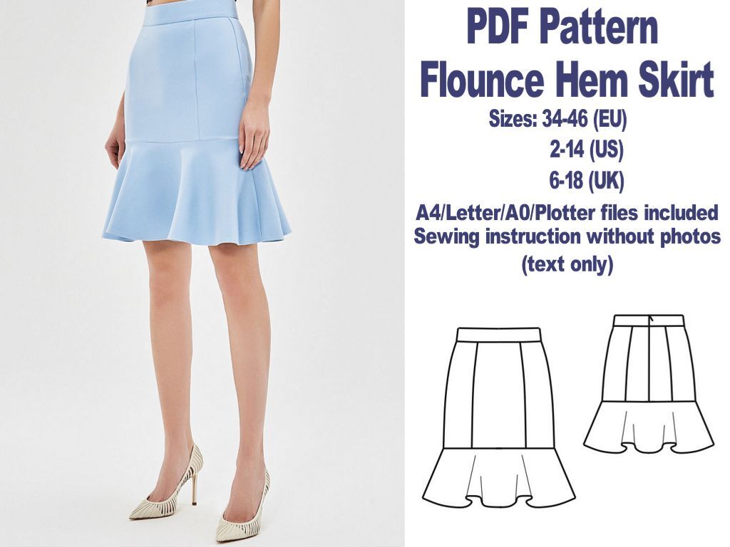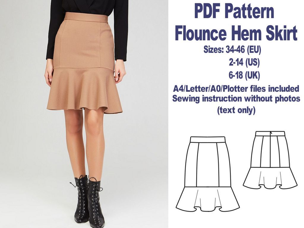 Flounce hem skirt with waistband and invisible zipper on the back, finished length from waist– 56 cm.