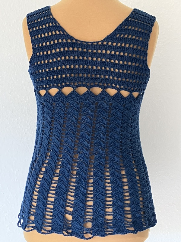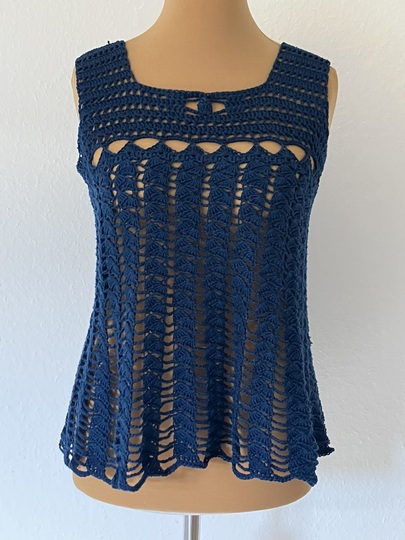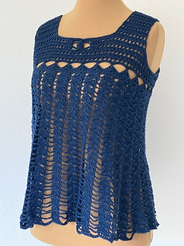 Prinzess-Stil bedeutet, hoch angelegte Taille, weiter Fall aber der Brust. Das ist eine Grantie ein guter Bauchwegschummler zu sein. Es ist ein leichtes Teil, das mit schwarzem BH oder einem weißen Unterhemd getragen werden kann. Wem die Dreiecke oben über der Brust nicht gefallen, der lässt sie einfach weg. Ich zeige, wie das geht. Das „Röckchen“ wird in der Runde gehäkelt. Man hat also keine Seitennaht. Nur die Schulter wird mit Nadel und Faden geschlossen. Für Geübte ist das Tip super-schnell gehäkelt. Für Anfänger ist es nicht geeignet.