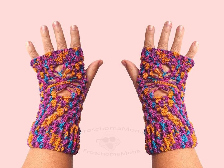 Die Handstulpen „Spider“ sind auch geeignet für Halloween, das Muster auf dem Handrücken erinnert etwas an Spinnweben. Wenn du dir einen kleinen Spinnenanstecker oder einen Knopf in Spinnenform im Mittelteil anbringst, hast du die Ideale Verkleidung für deine Hände.