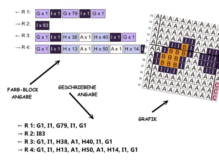 -farbige Zahlen-Blöcke für jede Reihe für feste Maschen (Stb od. hStb)