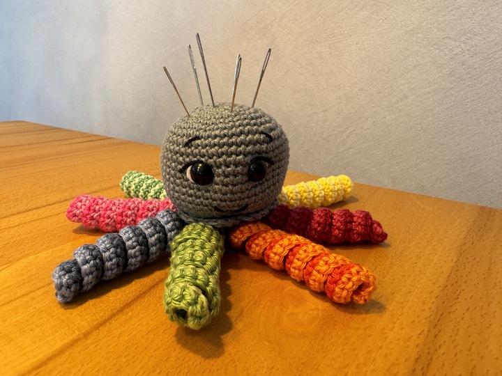 Ausführliche Anleitung zum Erstellen eines gehäkelten Quallen Nadelkissens. Dank vieler Schritt-für-Schritt Bilder und ausführlicher Beschreibung gut nachzuarbeiten.