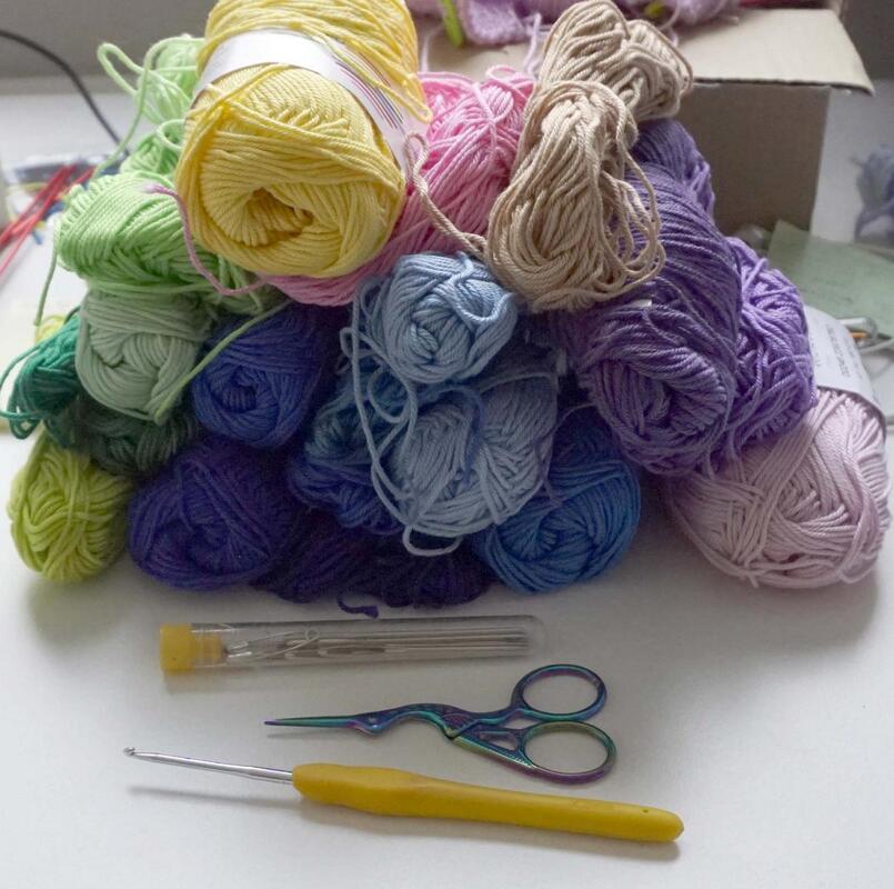 Ich habe verschiedene Wollreste in Blau und Grüntönen benutzt und nach ca. jeder 3. - 10. Runde gewechselt. Ihr könnt den Drachen aber auch einfarbig häkeln.