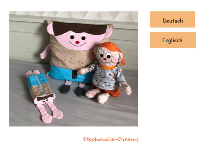 Genäht werden die Kissenhülle und die Federtasche aus Baumwollstoffen. Die Puppe wird aus Kuschelstoffen wie Minkeyfleece, Nicki oder Fleece genäht.