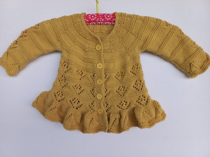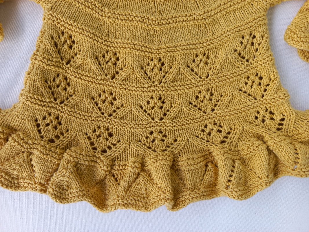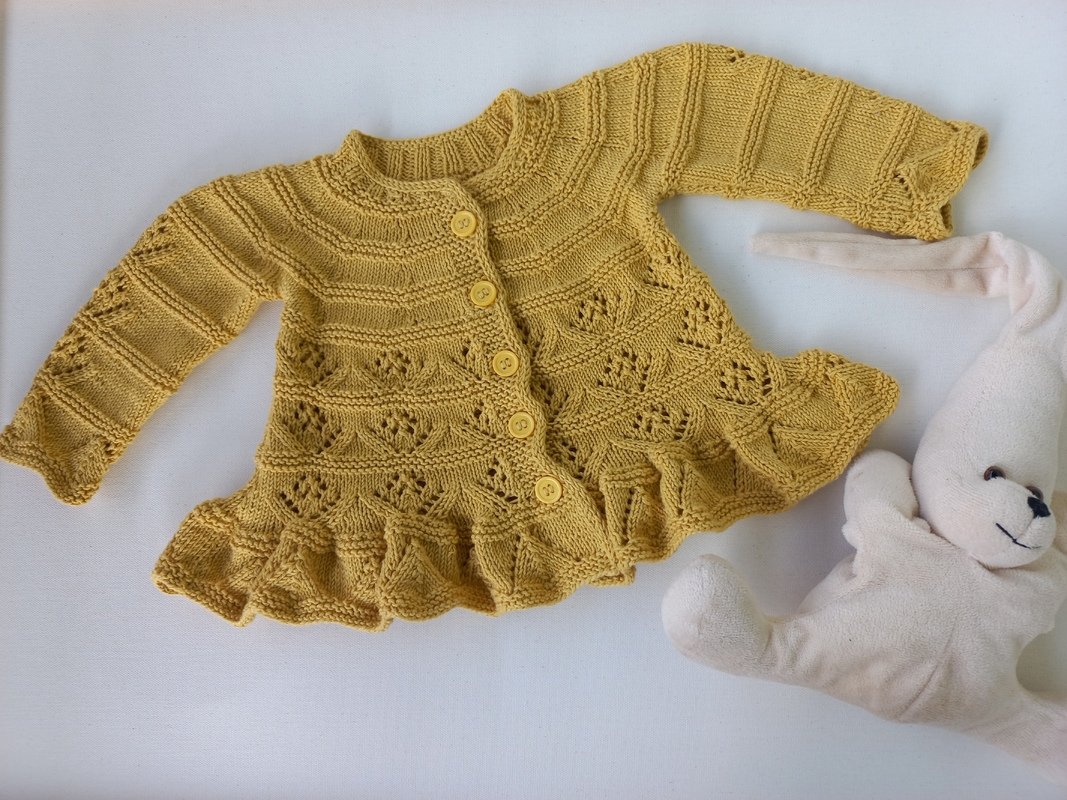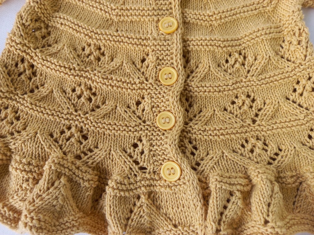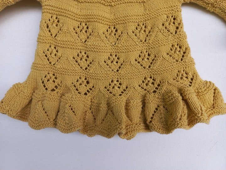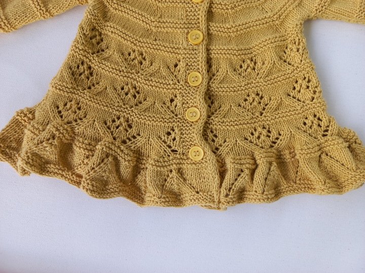 Hier bekommst du eine bis ins kleinste Detail erklärte 25-seitige Strickanleitung in deutsch für eine wunderschöne Babyjacke/Mädchenjacke mit Volant und einem tollem Lochmuster.