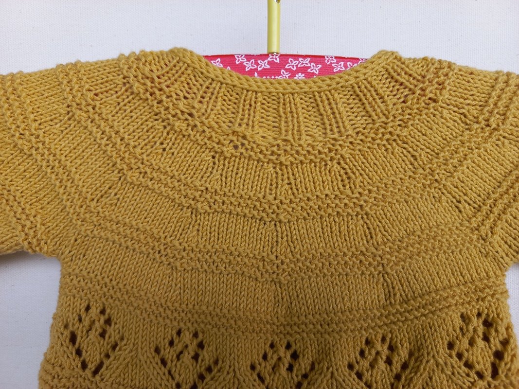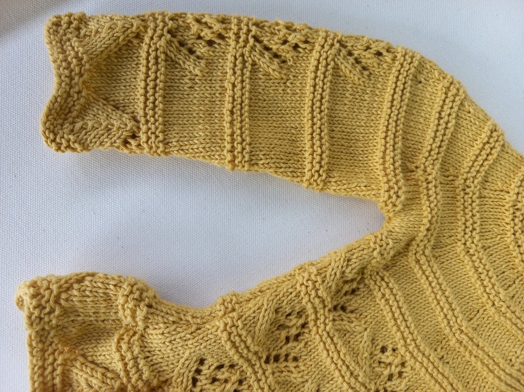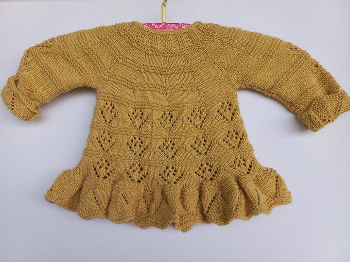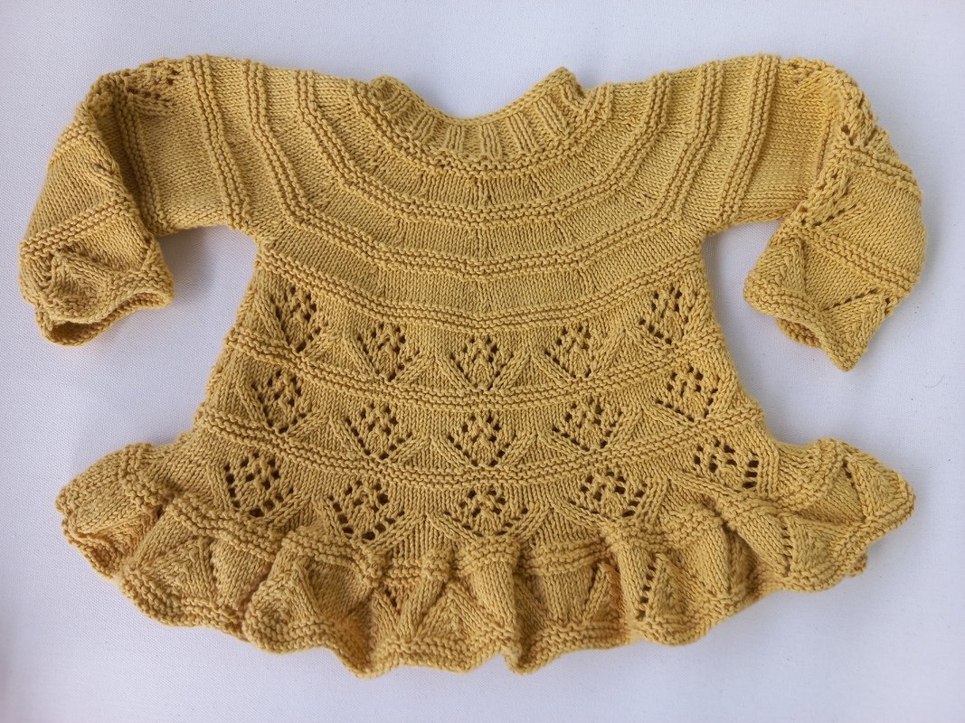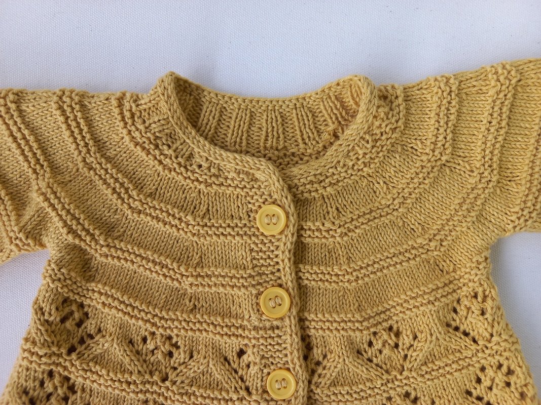Hier bekommst du eine bis ins kleinste Detail erklärte 25-seitige Strickanleitung in deutsch für eine wunderschöne Babyjacke/Mädchenjacke mit Volant und einem tollem Lochmuster.