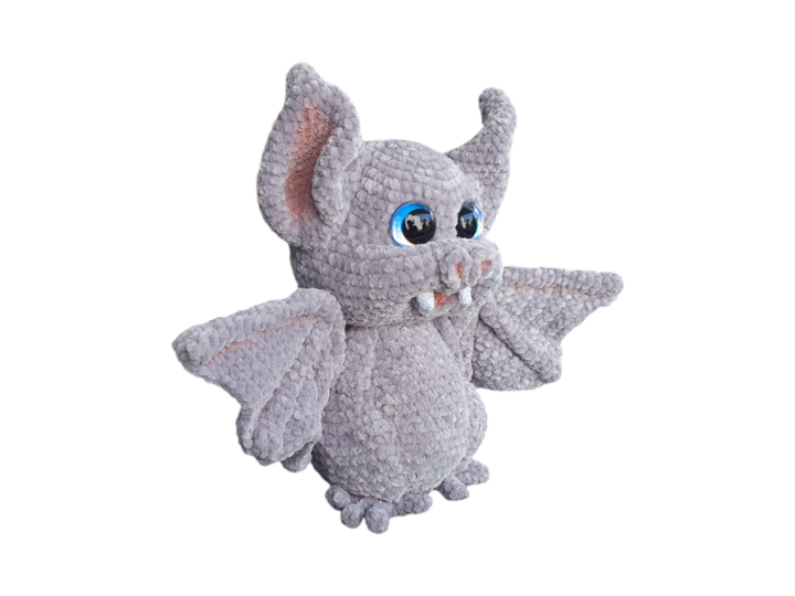 Von der Fledermaus habe ich leider kein Bild mit normaler Wolle. Du kannst aber damit rechnen, dass sie mut Baumwolle ca. 15 cm kleiner wird. Bei meinen anderen Anleitungen z.B. Booffy der Geist, beim Eichhörnchen Einin oder bei Beryll del Bienchen kannst du die Figuren vergleichsweise in Chenille und in Baumwolle sehen. Liebe Grüße