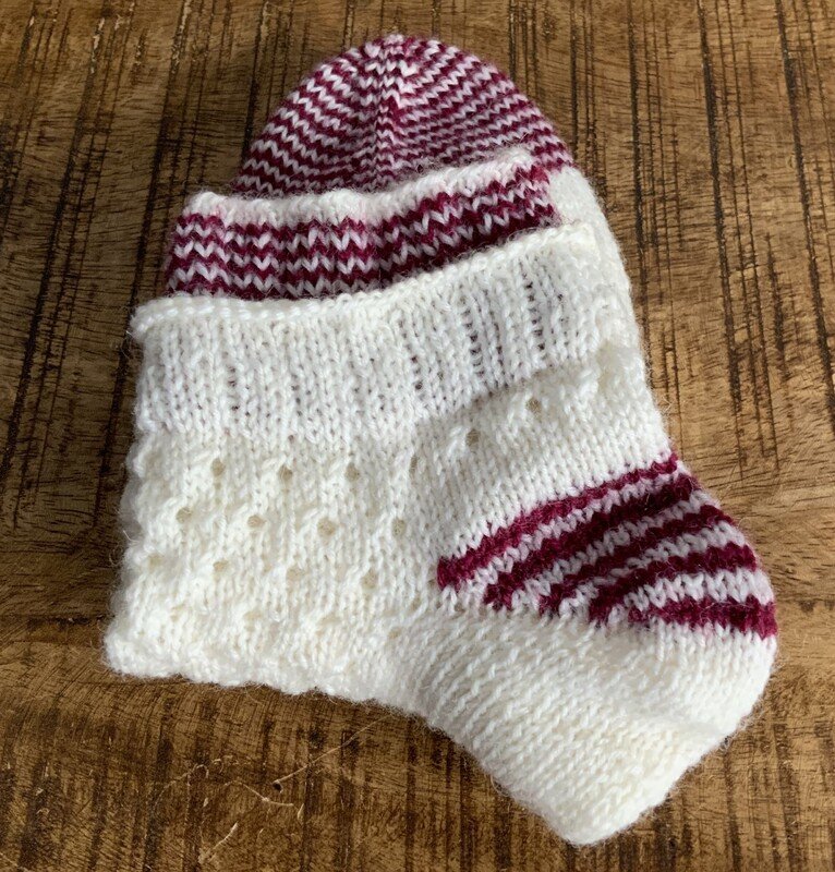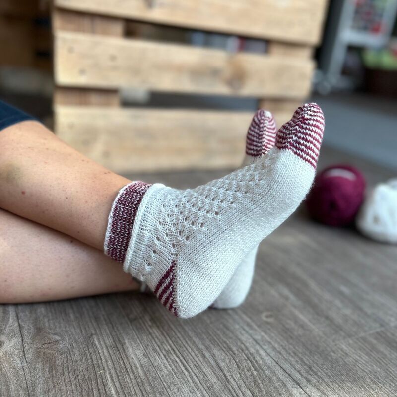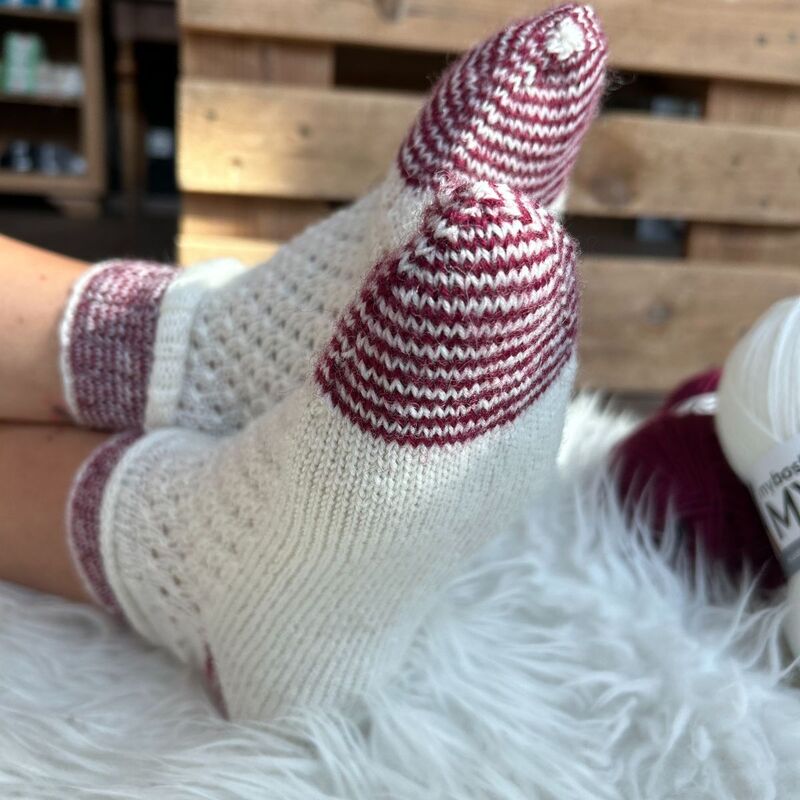 Die Mustersocken sind aus Sockenwolle von Myboshi, mysocks uni [75% Schurwolle, 25% Polyamid] in den Farben weiß und bordeaux