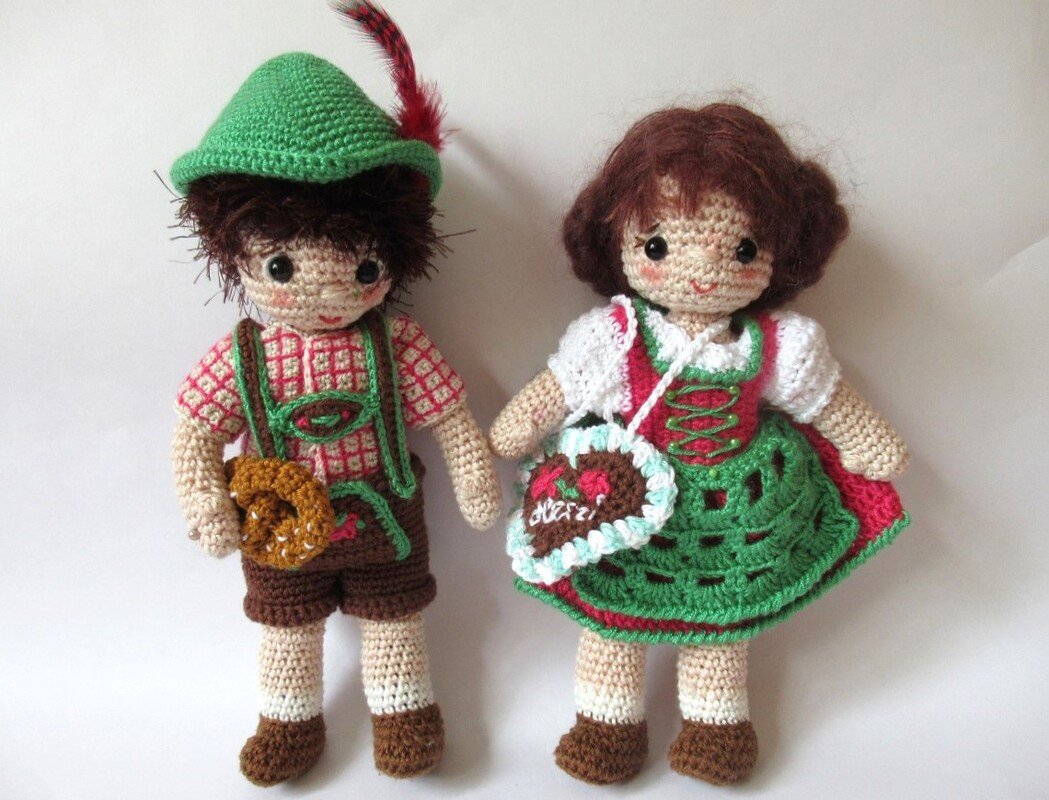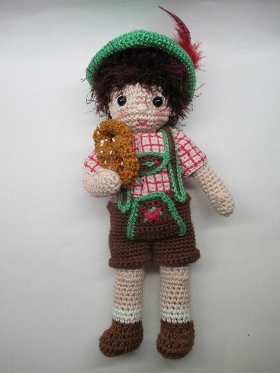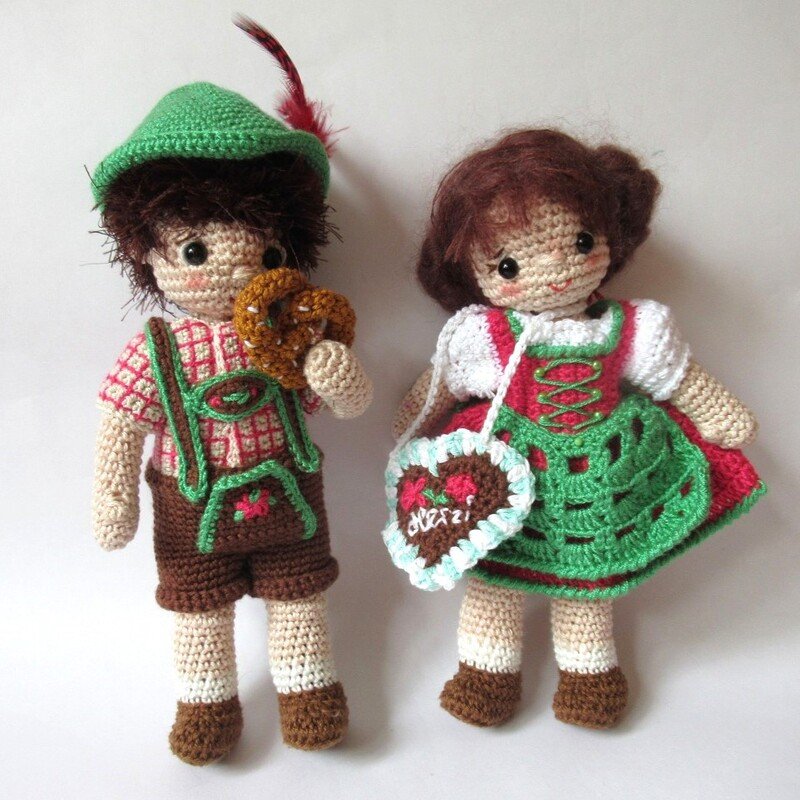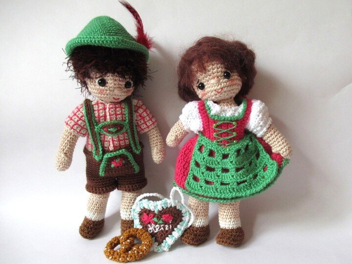 Anna und Anton gehen auf das Oktoberfest. Dazu müssen sie natürlich zünftig angezogen sein. Anna trägt ein rosa Dirndl mit grüner Schürze. Die Haare hat sie zu einer Flechtfrisur im Nacken festgesteckt. Anton trägt ein kariertes Hemd, eine "Leder"hose und einen grünen Trachtenhut. Die Kleidung kann man an- und ausziehen, so dass Anna und Anton auch andere Puppenkleider tragen können. Die Anleitung für das Lebkuchenherz und die Breze ist ebenfalls dabei.