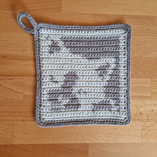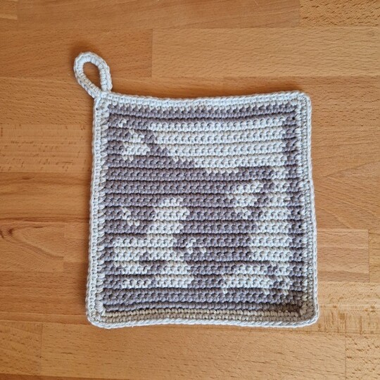 Mit der von mir verwendeten Wolle hat der Topflappen eine Größe von ca 20cm x 20cm