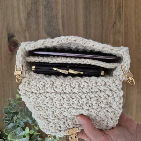 Sie hat im inneren einen Teiler mit eingehäkelt. So hat man zwei kleine Fächer.