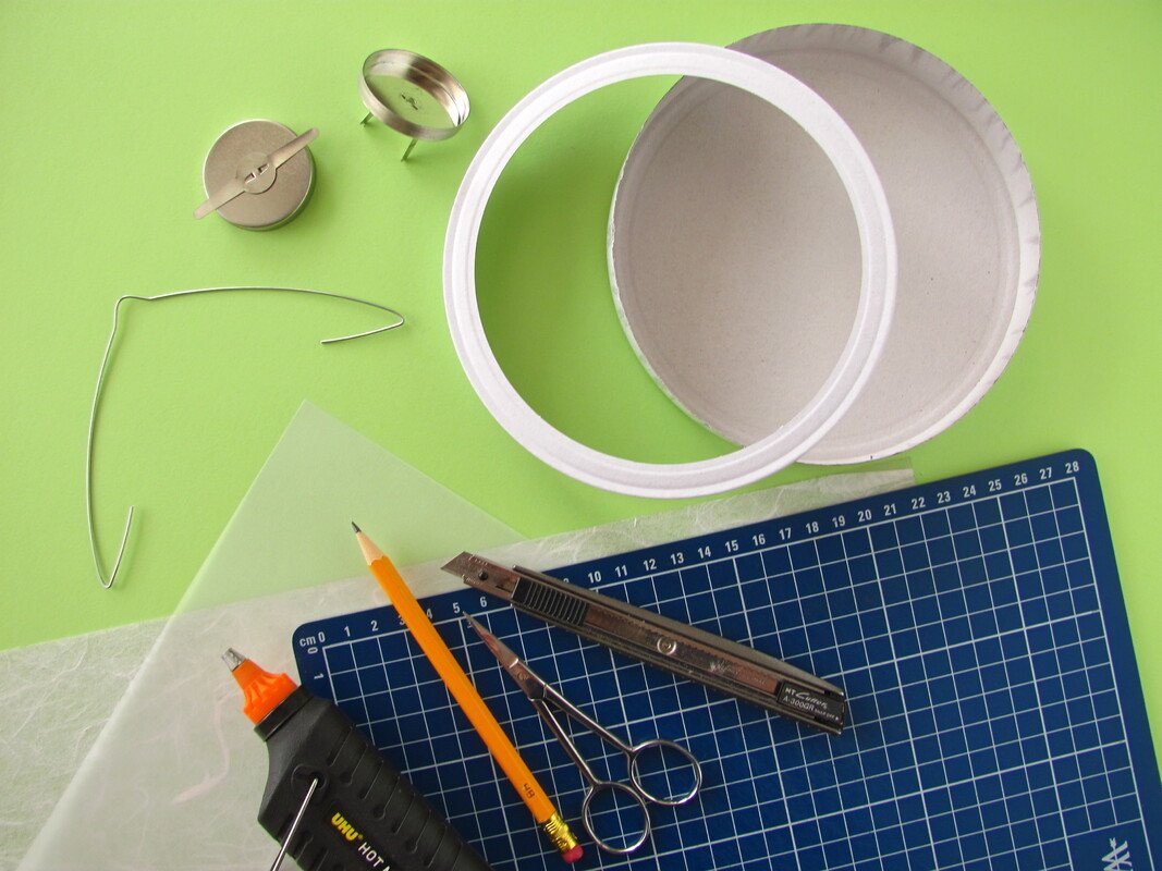 Laternenschachtel/Käseschachtel Ø 15 cm; Mobilefolie/Strohseide/Sprühkleber oder Alternativ grünes Transparentpapier zum Umkleben der Laterne; Fotokarton; Strassstein; Bunt- und Filzstifte; Gelstift Weiß; Transparentpapier Weiß; Bleistifte; Tesafilm; Cuttermesser mit Unterlage oder Scheren; Heißklebepistole/Klebstoff; Falzbein; Doppelklebeband; Drahthaltebügel oder Draht; Seitenschneider; Zange; Lineal; Optional: Kreis-Schablone; Laternen-Teelichthalter.