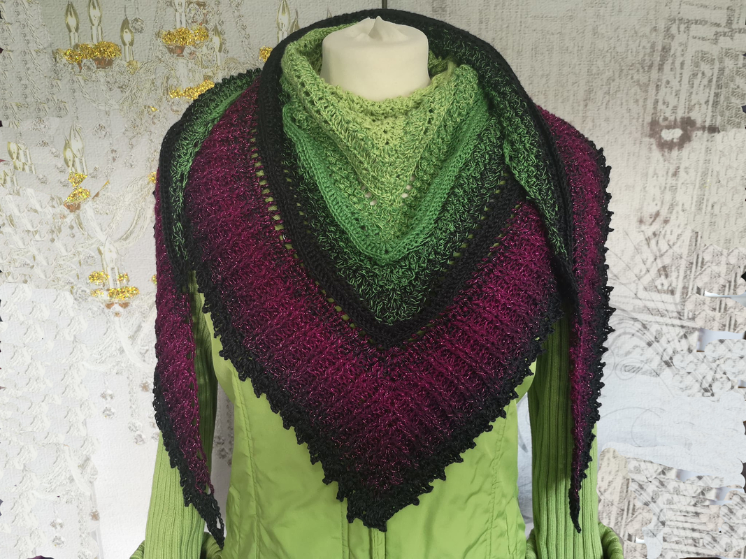 Walpurgisnacht ist ein halbflaches Tuch, dass mit einem 1000m Bobbel breit genug wird um es schön um den Hals wickeln zu können, aber auch Lauflängen von bis zu 1500m stehen ihm ausgezeichnet, dann kannst du es auch um die Schulter tragen. Viele lieben ja große Tücher. Passendes Garn findest du z.B. bei GeWolltes-die Gruppe auf facebook