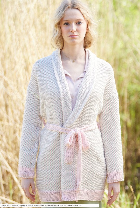 Ein langer Cardigan ersetzt schon mal eine Jacke oder einen Mantel in der Übergangszeit. Die hier mit Schalkragen und rosafarbenem Gürtel in Doppelstricktechnik kann vielfältig gestylt werden – wie hier zu einer weiten, eleganten Hose etwa, aber auch ganz casual zur Jeans. Das Hebemaschenmuster in zartem Rosa und Mint ist relativ einfach zu stricken, sodass die Jacke auch für StrickerInnen mit etwas mehr Strickerfahrung geeignet ist. Nur dauert das Arbeiten etwas länger. In den ganz geraden Teilen wird der Schalkragen gleich mitgestrickt. Wir haben dafür ein Schurwolle-Polyamid-Garn ewählt. Die Anleitung ist für die Größen 38/40, 42/44 und 46/48.