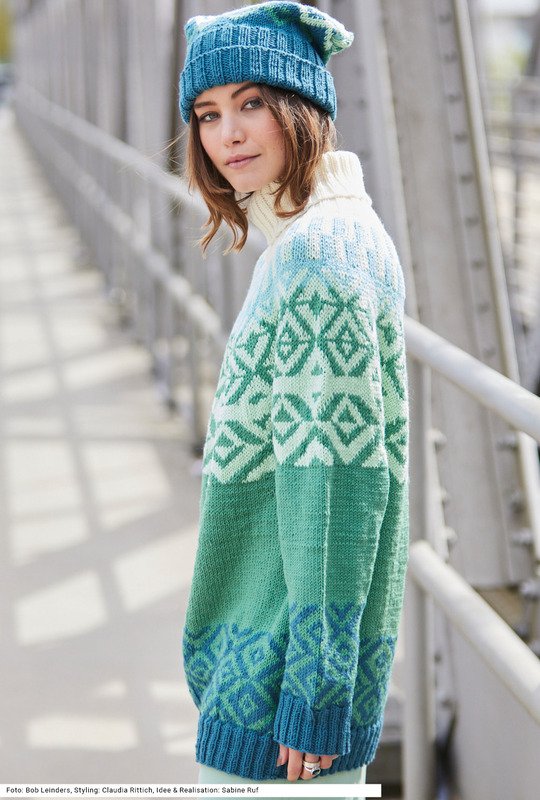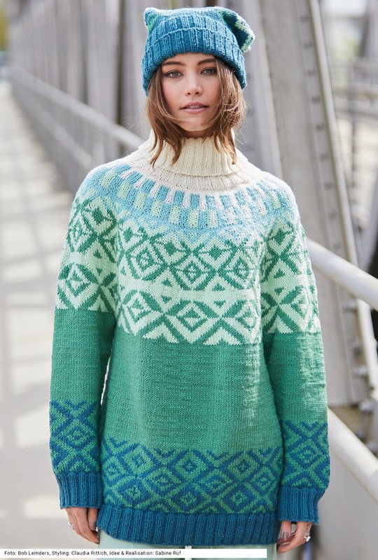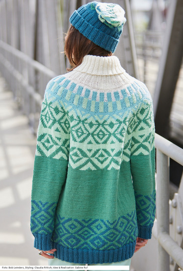 Der Rollkragenpullover mit Rundpasse wird von oben nach unten in einem Stück gearbeitet. Man beginnt mit dem naturweißen Rollkragen im Rippenmuster, das große Jacquardmuster dann über die ganze Passenbreite gestrickt und über dem Bund von Rumpf und Ärmeln noch mal ein ähnliches Muster als Bordüre platziert. Dazu gibt es eine passende Mütze im gleichen Muster mit einem breiten Rippenbund. Als Farben kommen hauptsächlich Petrol, aber auch Zartgrün, Grün und Mint zum Einsatz. Gestrickt wird mit einem Garn aus Schurwolle und Polyacryl. Die Anleitung gibt es in den Größen 36/38, 42/44 und 46/48, Mütze: 51 – 53, 54 – 56 und 57 – 59 cm Kopfumfang.