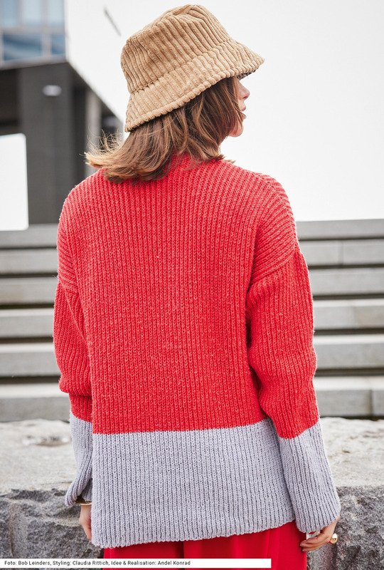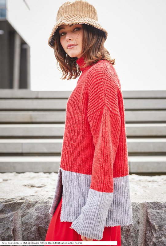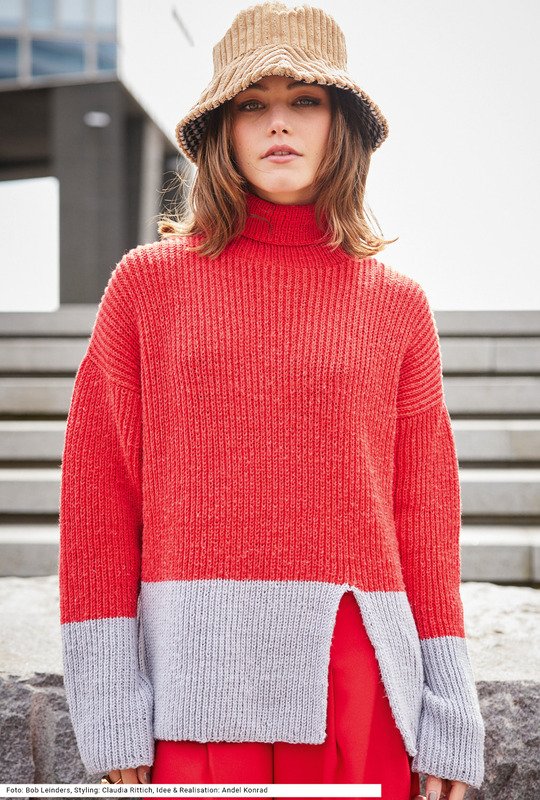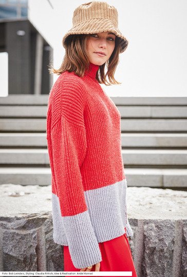 Dieser trendige Pulli mit einem asymmetrischen Schlitz im Vorderteil kommt direkt auf den Punkt – also perfekt für alle, die es minimalistisch lieben. Das Modell setzt auf den Kontrast zwischen feurigem Rot und kühlem Hellgrau. Bis auf den Rollkragen, der im 1/1-Rippenmuster gearbeitet wird, ist er ganz im Halbpatent gestrickt. Das edle Garn aus extrafeiner Merinowolle und Seide wärmt nicht nur, es hat auch eine weiche, anschmiegsame Haptik. Die Anleitung hierfür gibt es in den Größen 40/42, 44/46 und 48/50.