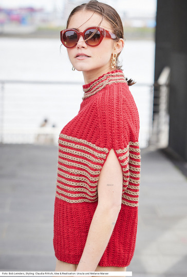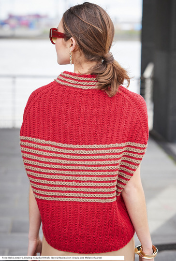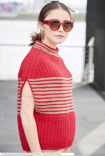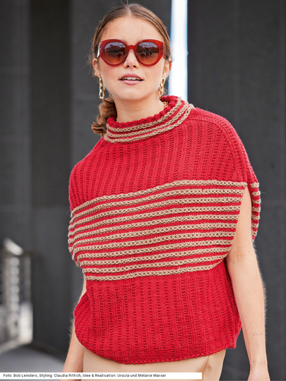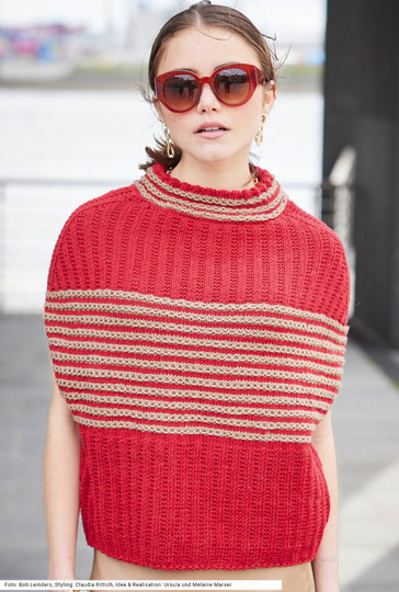 Distinguiert und sehr individuell ist dieser Pullunder im oversized Style. Ob, wie hier im Bild, solo zum schmal geschnittenen Rock und oder auch lässig über einem engen Langarm-Shirt und Jeans – er peppt jeden Look auf. Die Musterstreifen aus Hebemaschen in Rot und Karamell im Brustbereich werden darunter und darüber flankiert von einem roten Rechts-links-Muster. Interessant ist der Schnitt: Von unten nach oben wird er immer breiter, die Armausschnitte sind gerade und die Schulter ist stark abgeschrägt. Für das Modell aus reiner Merinowolle steht eine Anleitung in den Größen 36/38, 40/42 und 44/46 zur Verfügung.