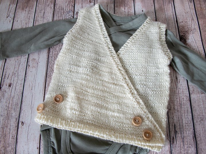 Bei der Anleitung handelt es sich um einen Wickel Slipover für Babys. Einfach gehalten, weitestgehend (bis auf die Bündchen) in glatt rechts gestrickt.