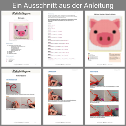 In der Anleitung wird keine Häkelschrift verwendet. Die Maschentabelle ist so gestaltet, dass das Häkeln durch fertig gezählte Maschen erleichtert und beschleunigt wird. Es wird in Reihen und festen Maschen gehäkelt.