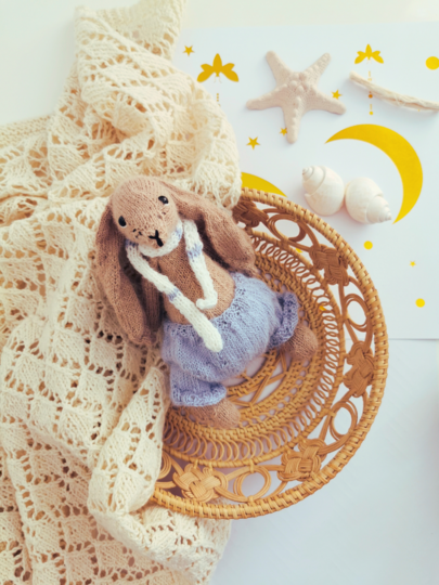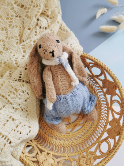Fertige Größe: 21 cm, gehäkelt mit Alpaka Nr. 6205 hellblau, Alpaka Nr. 302 kamel, Alpaka Nr. 1101 weiß (101), safran 17 weiß und safran 16 schwarz und 2,0 mm Stricknadel.
