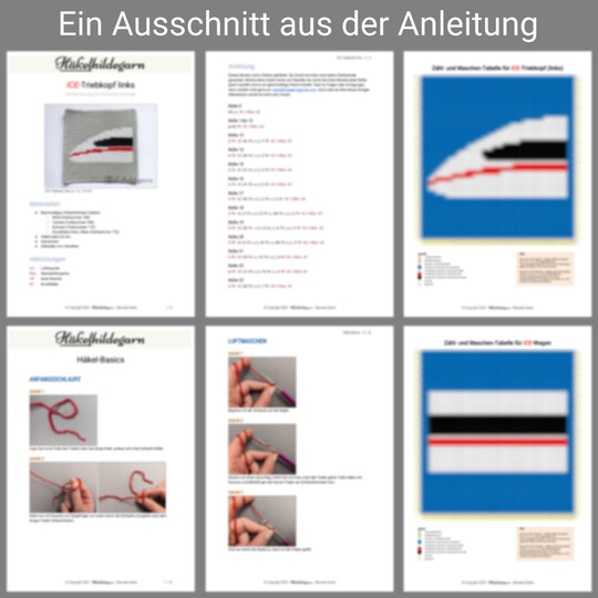 Häkelanleitung (29-seitige PDF-Datei) für ICE-Triebköpfe und Wagen im Quadrat (ca. 15 cm × 15 cm). Aus mehreren fertigen Quadraten kannst du z.B.: einen Tischläufer oder Schal herstellen oder sie aber auch einzeln als Untersetzer oder Topflappen verwenden. In der Anleitung wird keine Häkelschrift verwendet. Die Maschentabelle ist so gestaltet, dass das Häkeln durch fertig gezählte Maschen erleichtert und beschleunigt wird.