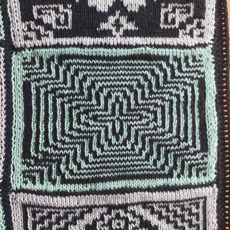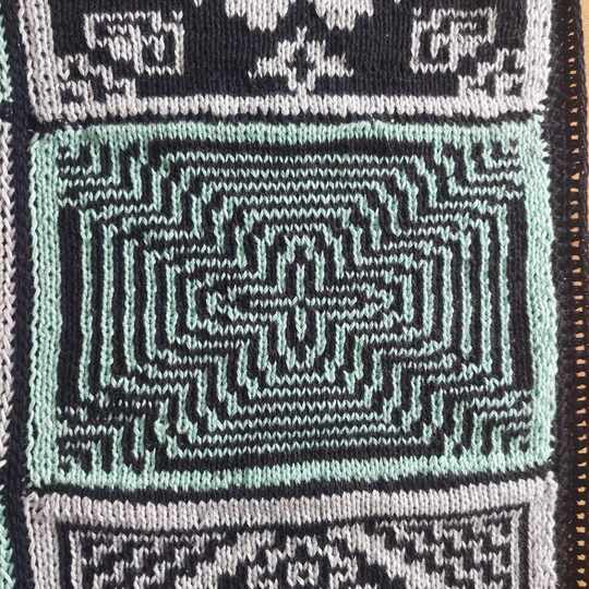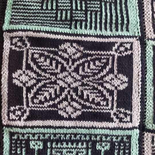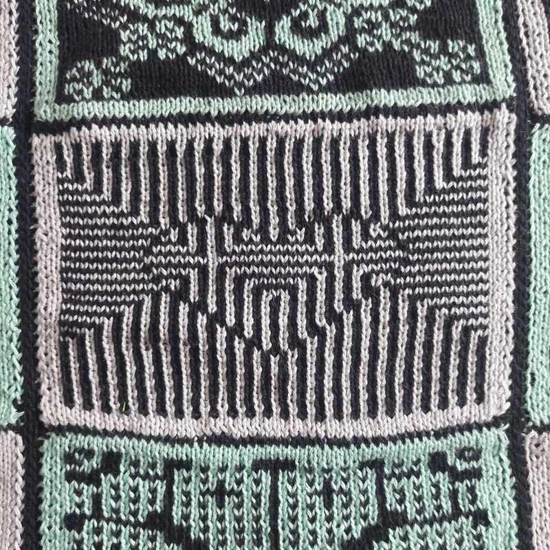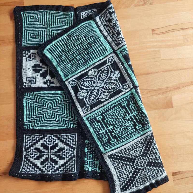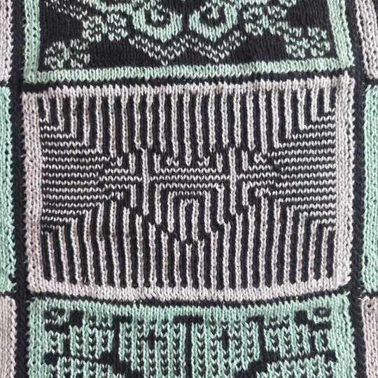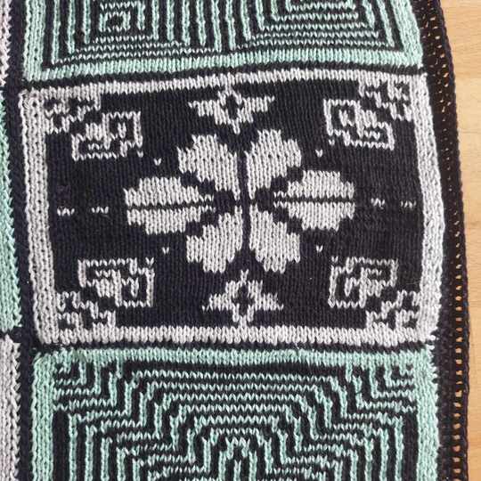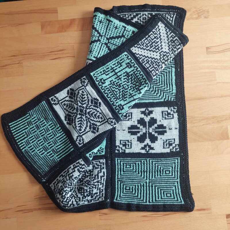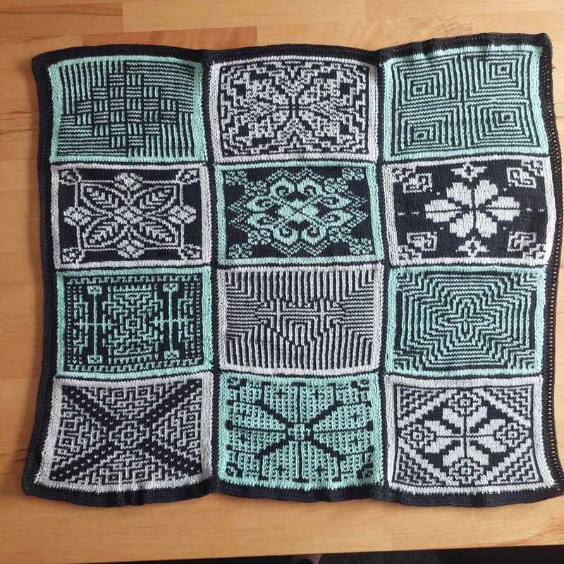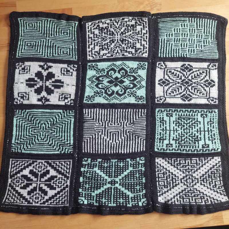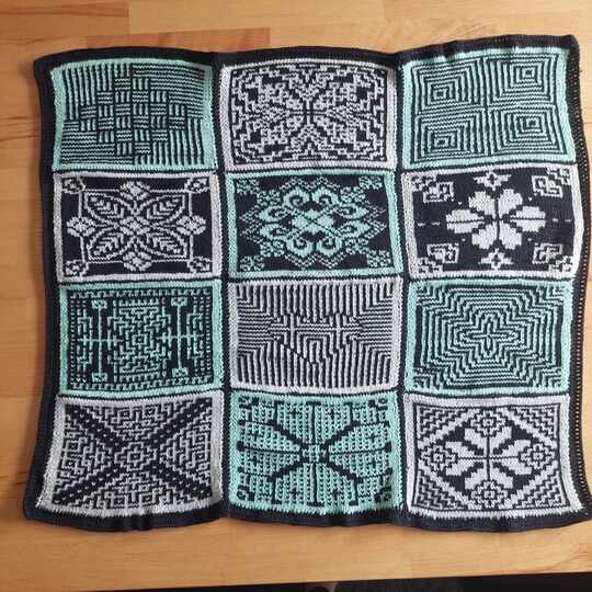 Diese Decke besteht aus 12 einzelnen Patches, Vierecken mit unterschiedlichen Mustern. Die Muster werden zweifarbig gearbeitet und man muss lediglich linke und rechte Maschen beherrschen. Die Zusammensetzung ist absolut nach dem eigenen Geschmack möglich und auch die Größe der entstehenden Decke ist frei wählbar, in dem man entscheidet, ob und wie viele Patches wiederholt werden sollen.