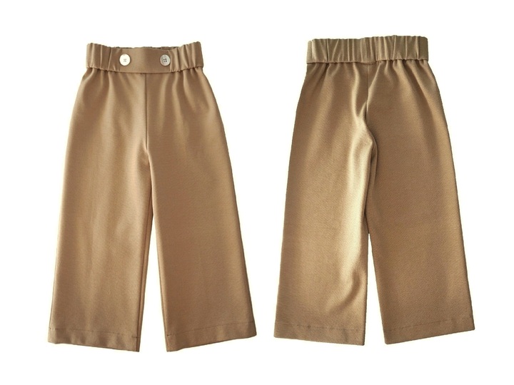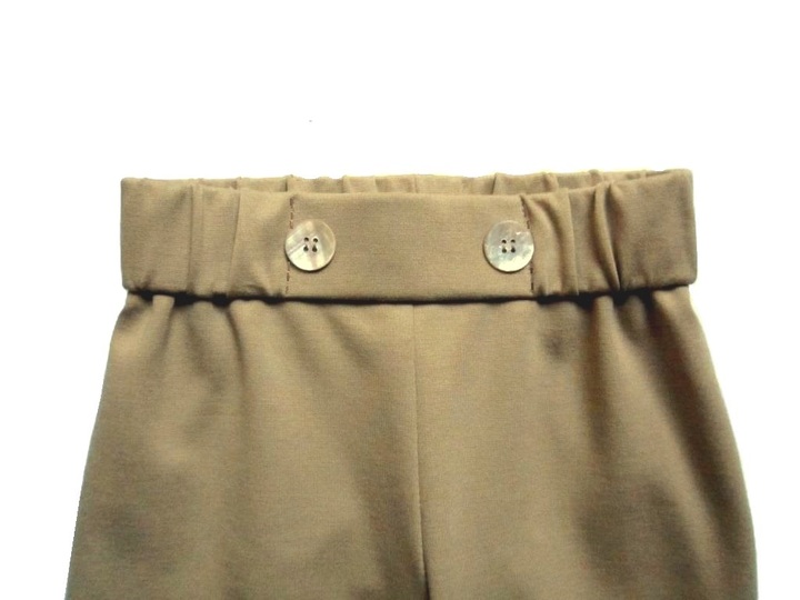 Schnittmuster für eine trendige, weite Jerseyhose für Mädchen. Dieses Modell ist einfach zu nähen und daher auch für NähanfängerInnen bestens als Einstieg geeignet: Es braucht keinen Verschluss, sondern hat nur einen Tunnel mit Gummizug zum Reinschlupfen. Es sind keine Näharbeiten dabei, die besondere Nähkenntnisse erfordern. Der Gummizug ist praktisch zum Anziehen und die Weite der Hose macht sie besonders bequem. Der Bund wird im vorderen Bereich auf dem Gummiband glatt verarbeitet und nur hinten und seitlich gekräuselt. Damit bietet sich der glatte Bereich für Dekorationen an, Ihr könnt entweder 2 Knöpfe aufsetzen wie bei einer Marine-Hose, oder 2 Bänder annähen, um eine Schleifen zu binden. Beide Varianten sind in der Anleitung erklärt. Auch ohne Deko sieht die Bundlösung mit ungekräuselter Mitte gut aus.