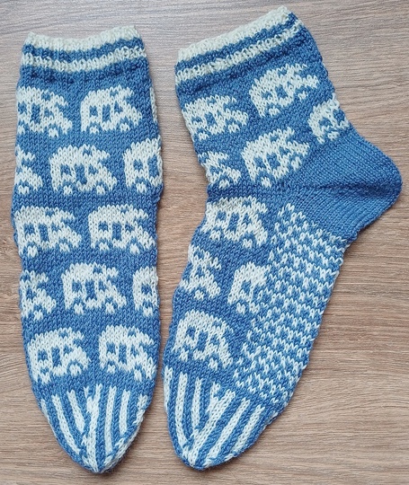 Die fertigen Socken ergeben Grössen ab ca. 35 bis etwa Grösse 43. Je nach Nadelstärke ergibt es eine andere Grösse.