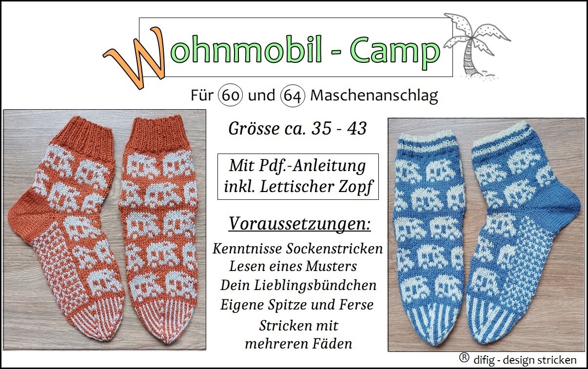 Campingzeit ist ja eigentlich immer und daher kannst du diese Socken das ganze Jahr tragen. Am besten strickst du sie für die ganze Familie und vielleicht brauchst du noch ein Geschenk für einen Camperfreund oder Freundin.