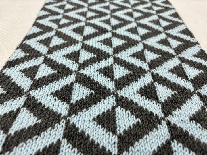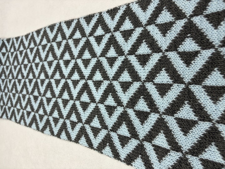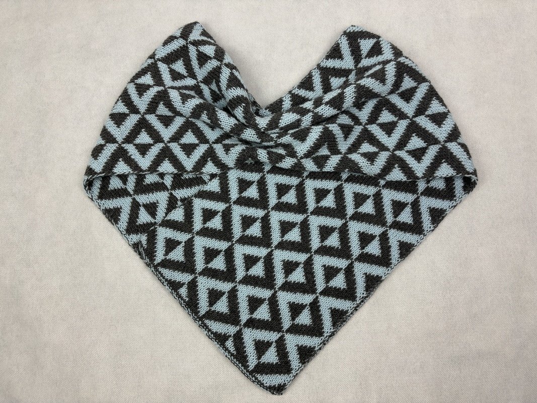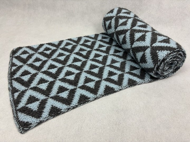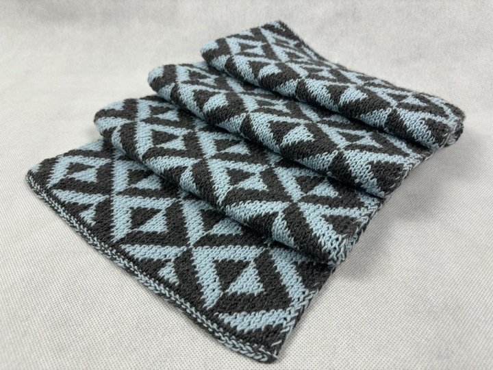 Die Farbe der Wolle erinnerte mich an Schieferstein und einen bleichblauen Himmel, so wie man dies manchmal in den Bergen sieht. Der Himmel gespiegelt in einem kleinen See mit Schiefersteinen. Das Wasser berührt von dem Wind. Der Gedanke hat mich zu dem Muster «Spiegelungen» dieses Schals inspiriert. Und es ist nicht bei einem Schal geblieben. Dazu passende Accessoires wie eine Mütze (hier erhältlich: https://www.crazypatterns.net/de/items/104823/wendemuetze-spiegelungen-eine-double-face-strickanleitung) und Armstulpen (hier erhältlich: https://www.crazypatterns.net/de/items/105097/armstulpen-spiegelungen-eine-double-face-strickanleitung) sind auch erhältlich in meinem Shop.