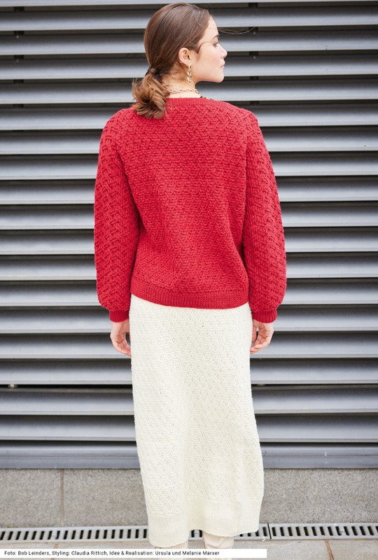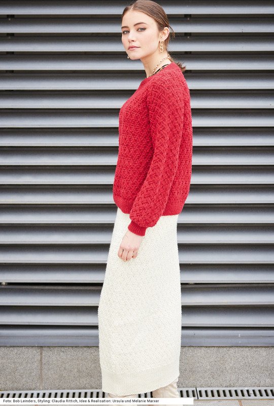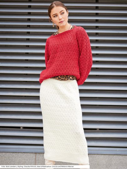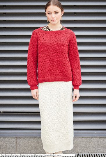 Ein Set, das aus einem weichen reinen Merinogarn gestrickt wird. Dieses Komplett-Outfit besteht aus einem Pullover in kräftigem Rot und einem langen Rock in Wollweiß. Für beide wird ein Flechtmuster aus verkreuzten Maschen gestrickt, bei dem Konzentration erforderlich ist. Der Pulli wird samt Ärmeln in einem Stück über die Schultern hinweg gearbeitet, der Rock besteht aus zwei geraden Bahnen mit Bündchen. Um den eckigen Halsausschnitt wird zum Schluss eine Blende in Doppelstrick-Technik gestrickt. Die Anleitung dazu gibt es für die Größen 38/40, 42/44 und 46/48.