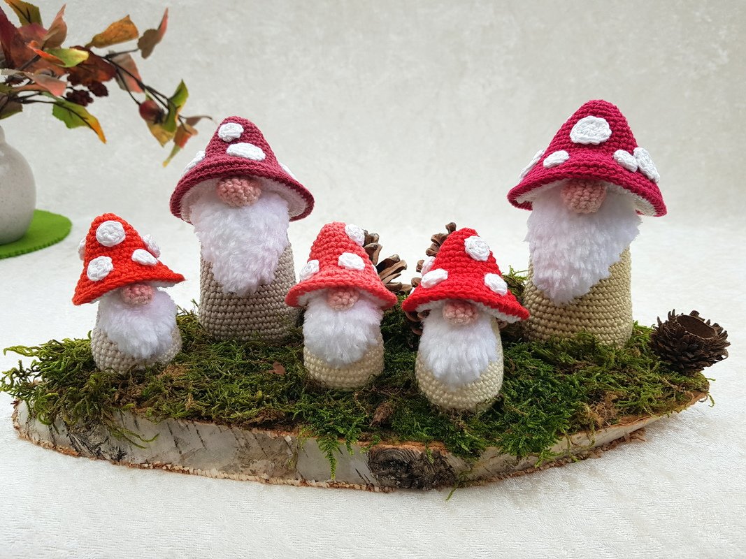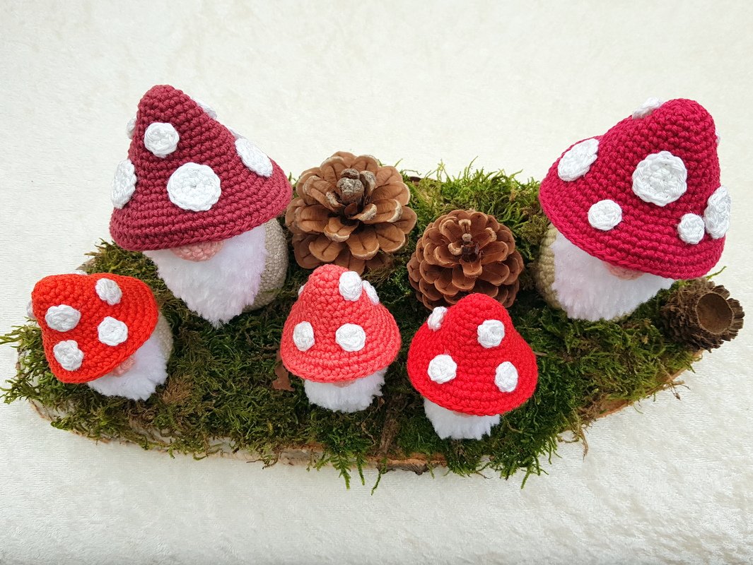 Diese süßen Pilzwichtel mit ihren knalligen Hüten sind ein echter Blickfang.