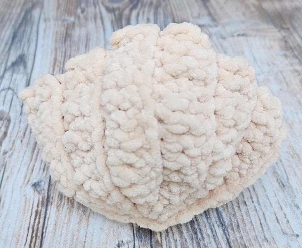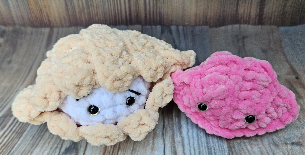 Mit der angegebenen Wolle und mit einer Nadelstärke von 5,5mm wird die große Muschel eine Höhe von ca. 6cm und eine Breite von ca. 13cm und die kleine Muschel eine Höhe von ca. 2cm und eine Breite von ca. 9cm haben. Bitte beachtet, dass die Größe variieren kann.