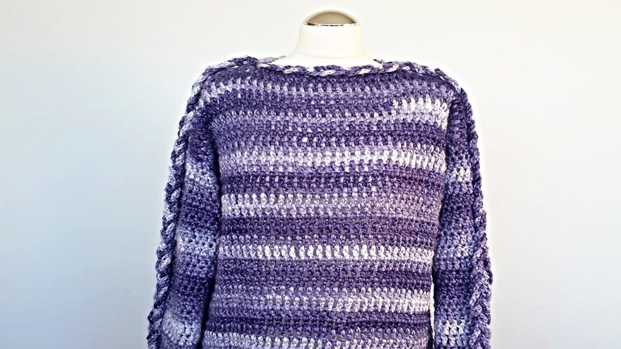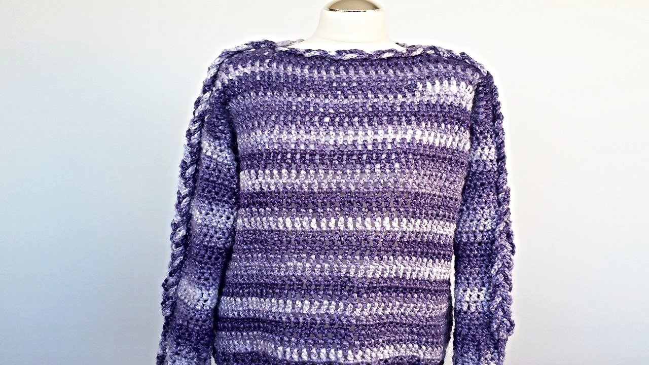 Ein gehäkelter Damen Winterpulli ,mit einem einfachen Muster,dafür aber mit einem auffälligen Zopf,der sich von einem Ärmelbündchen über den Halsausschnitt bis zum anderen Ärmelbündchen zieht.
