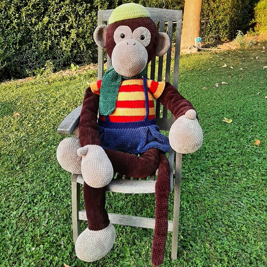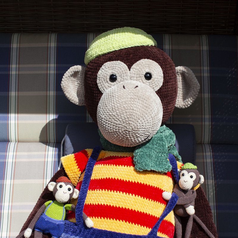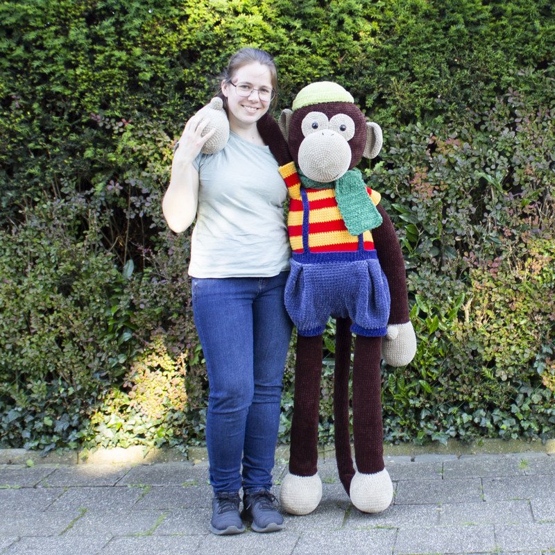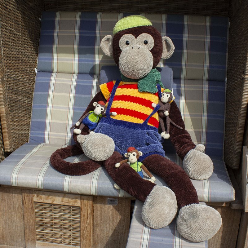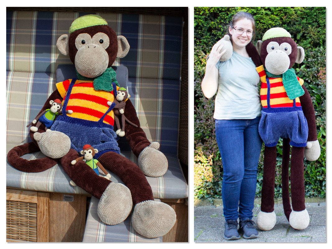 Mit Chenillegarn (120m/100g) wird der Affe im Stehen ca. 1,40m groß. Die Größe kann allerdings, vor allem bei Chenillegarn, stark abweichen.